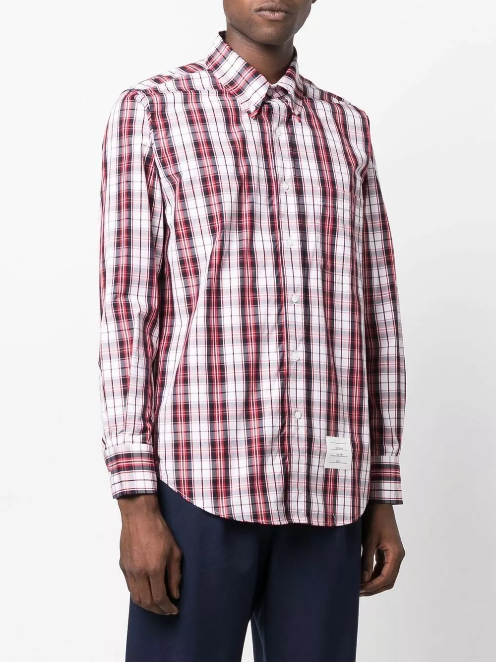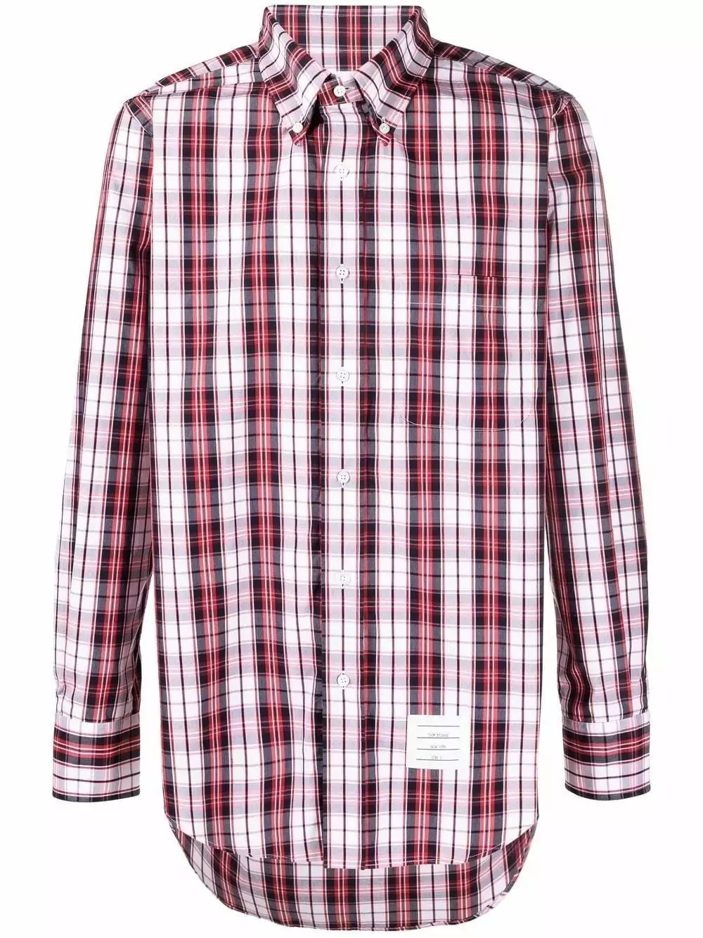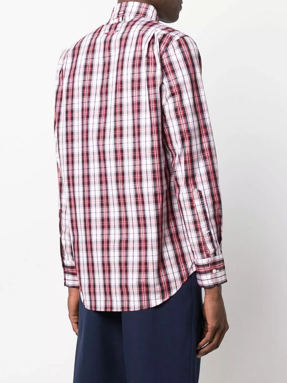 Thom Browne combines a check print with a timeless button-down silhouette. This cotton shirt features a logo patch on the front and falls to a curved hem.