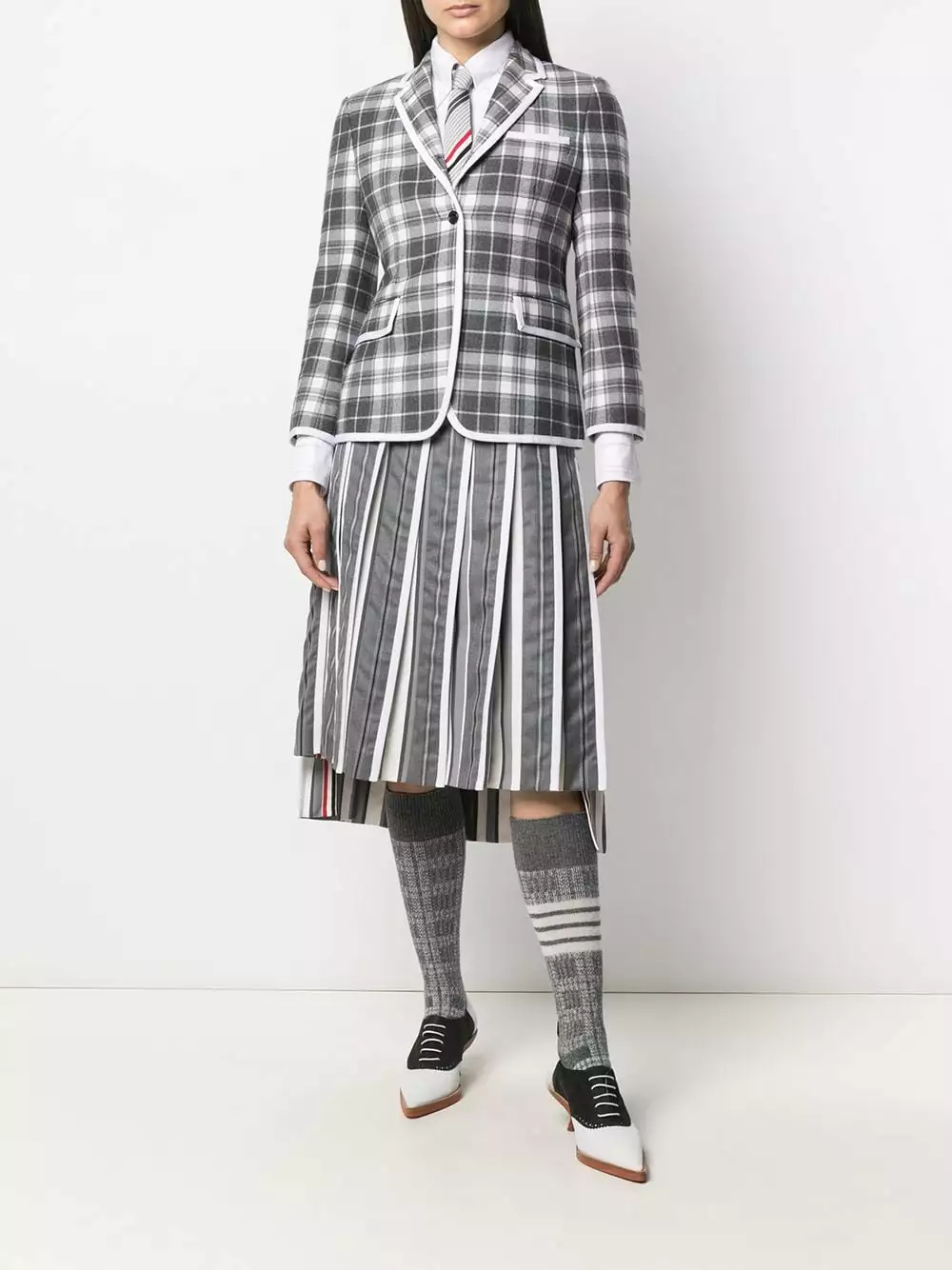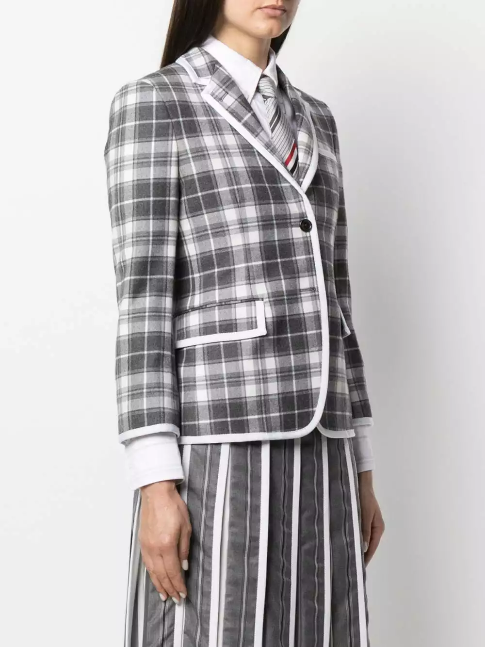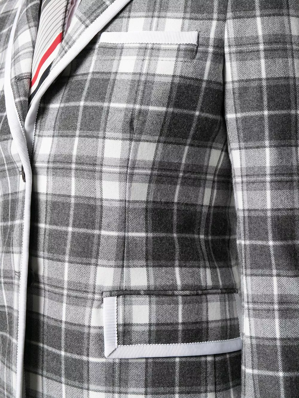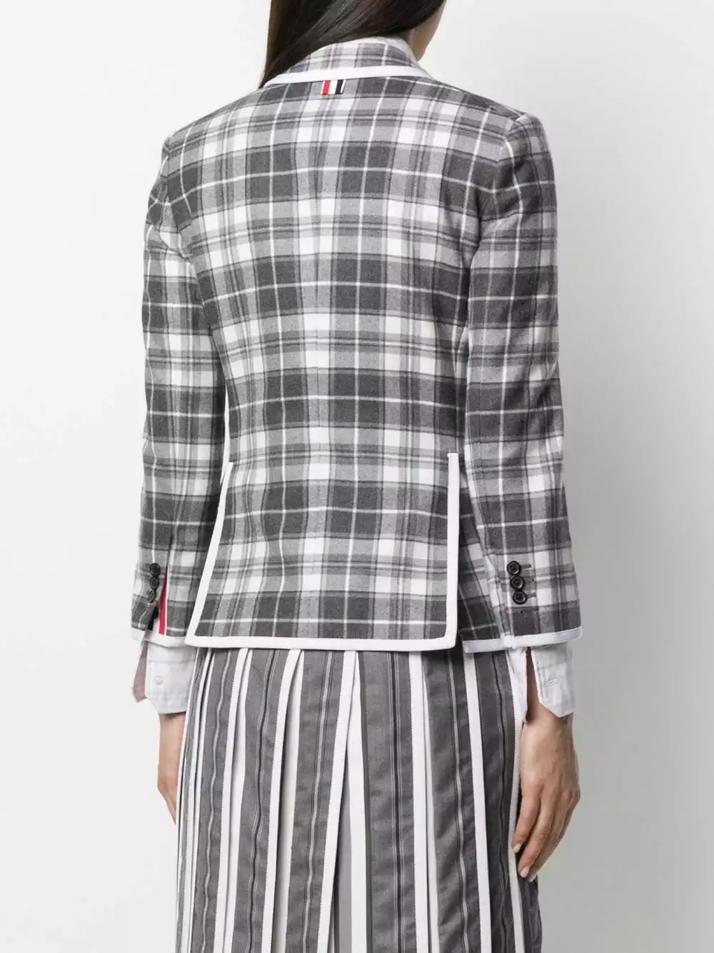 A classic silhouette but make it Thom Browne. Crafted from wool flannel, this sport coat features a tartan check pattern that suits the modern woman who values elegance above all. Impeccable tailoring.