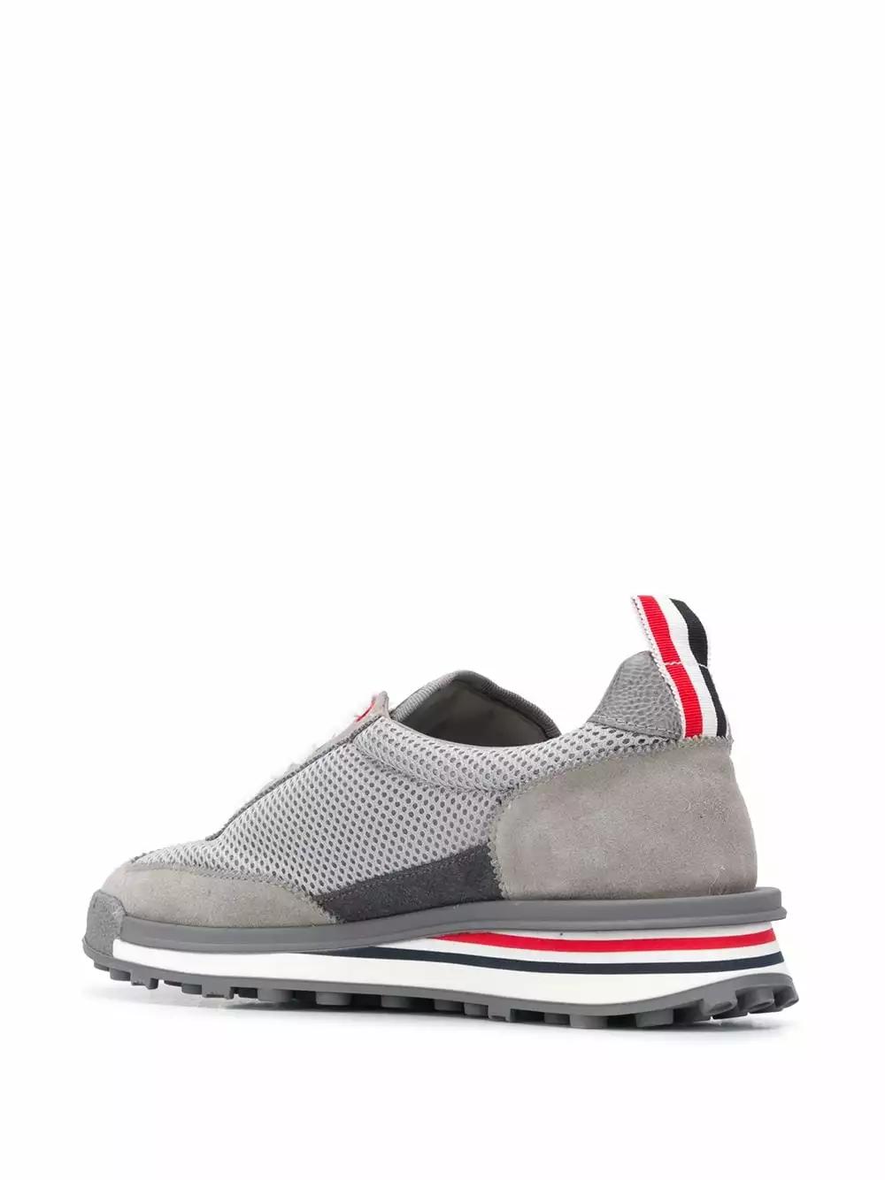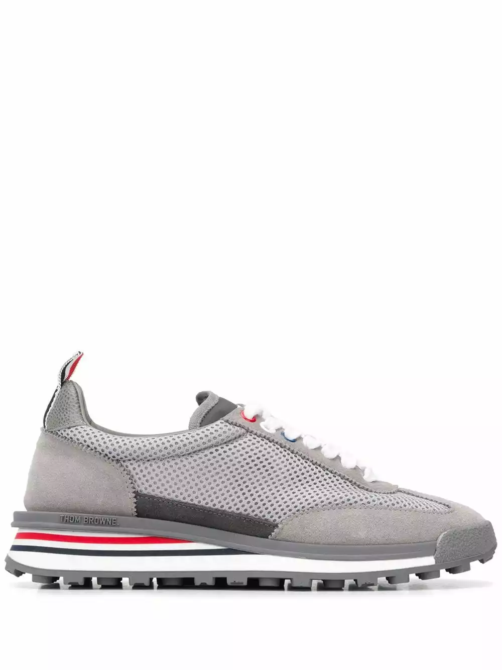 We know you’re constantly on the go. So make sure you’re ready for the busy day ahead with these dark grey Tech Runner shoes from Thom Browne. If your feet could speak, they’d thank you for this functional footwear. Featuring mesh panels, suede panels, a lace-up front fastening, a round toe and an RWB tab.