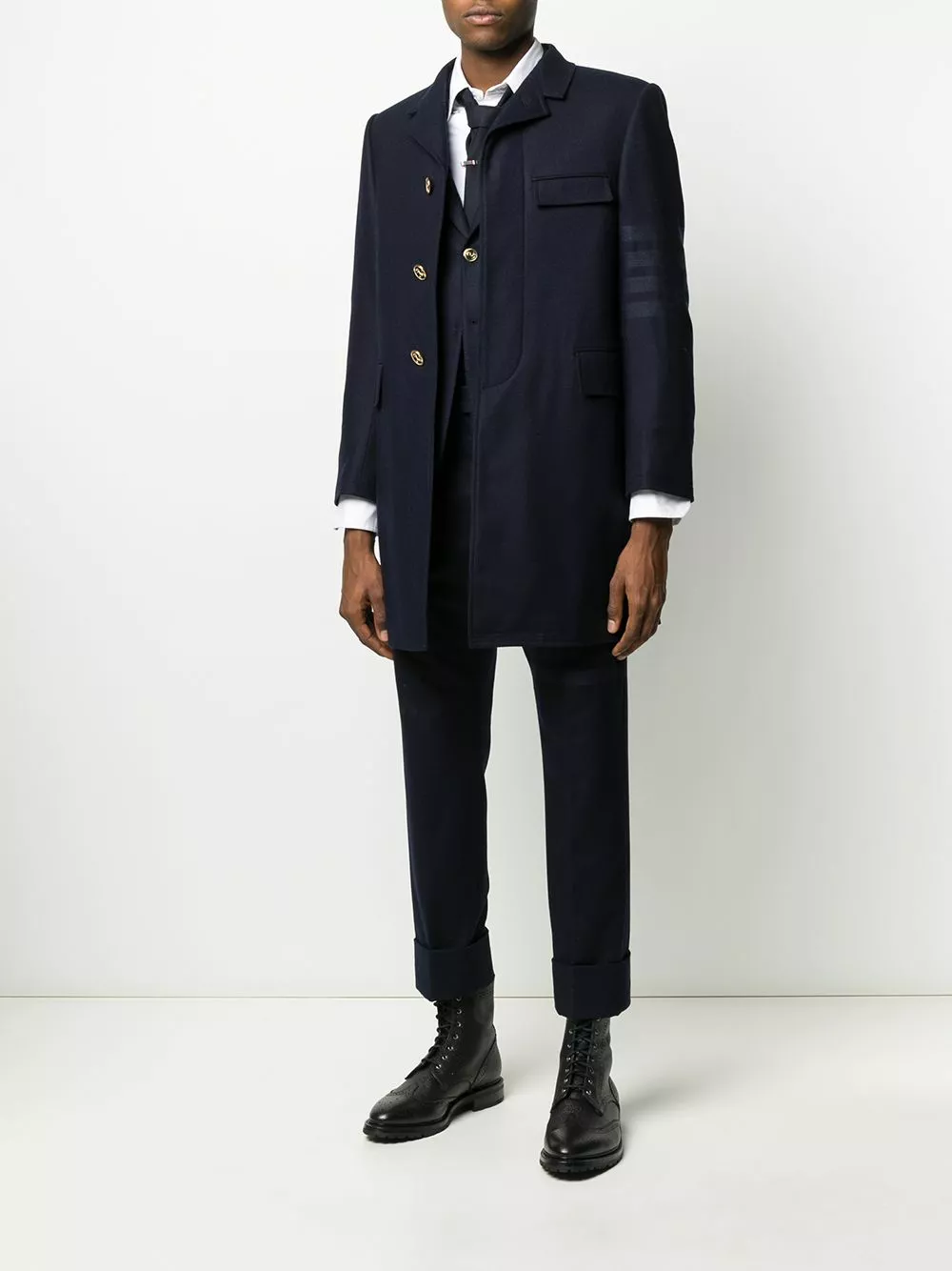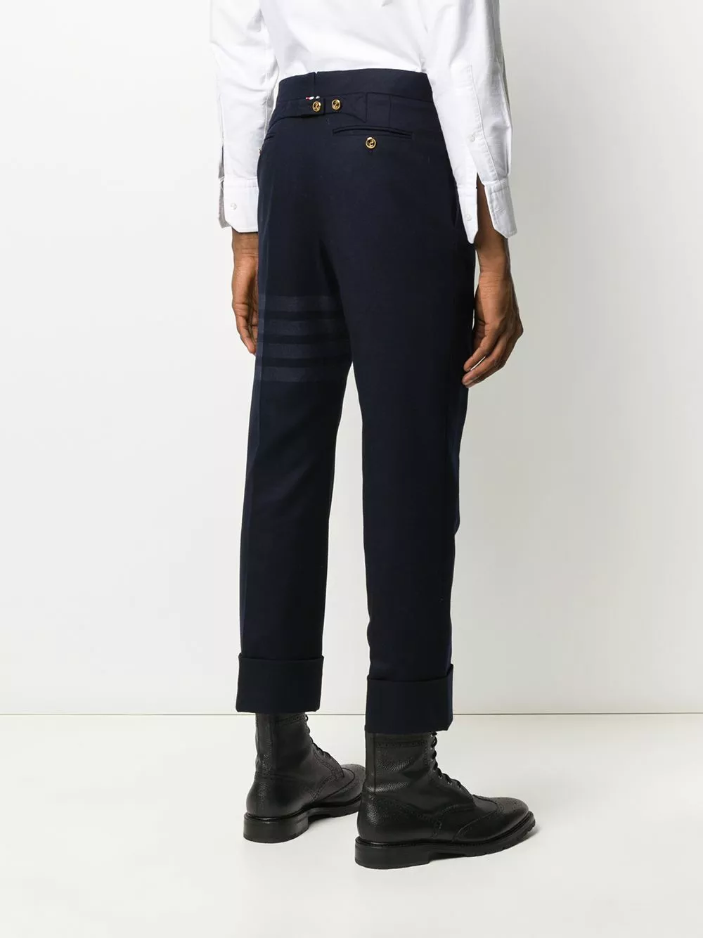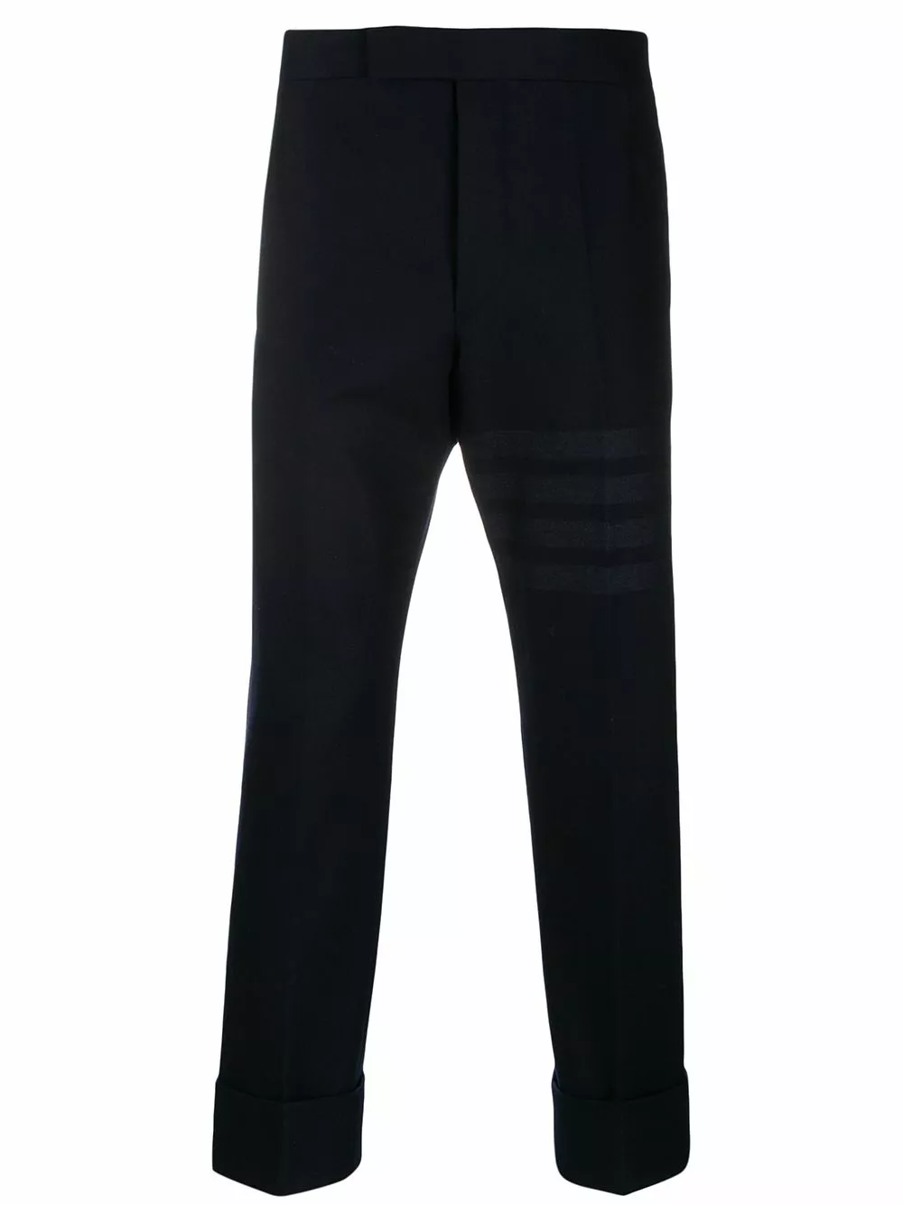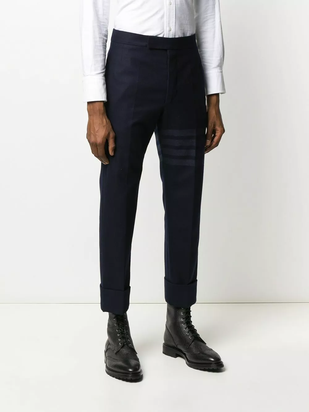 As Oscar Wilde once said, “you can never be overdressed or overeducated.” Make sure you follow that wise piece of advice and incorporate these navy wool-cashmere blend tonal 4-Bar flannel trousers from Thom Browne into your daily looks. Suit up! Featuring an off-centre front button fastening, a rolled hem, a cropped length, a slim fit, rear welt pockets, side slit pockets and a signature tri-colour striped trim.
