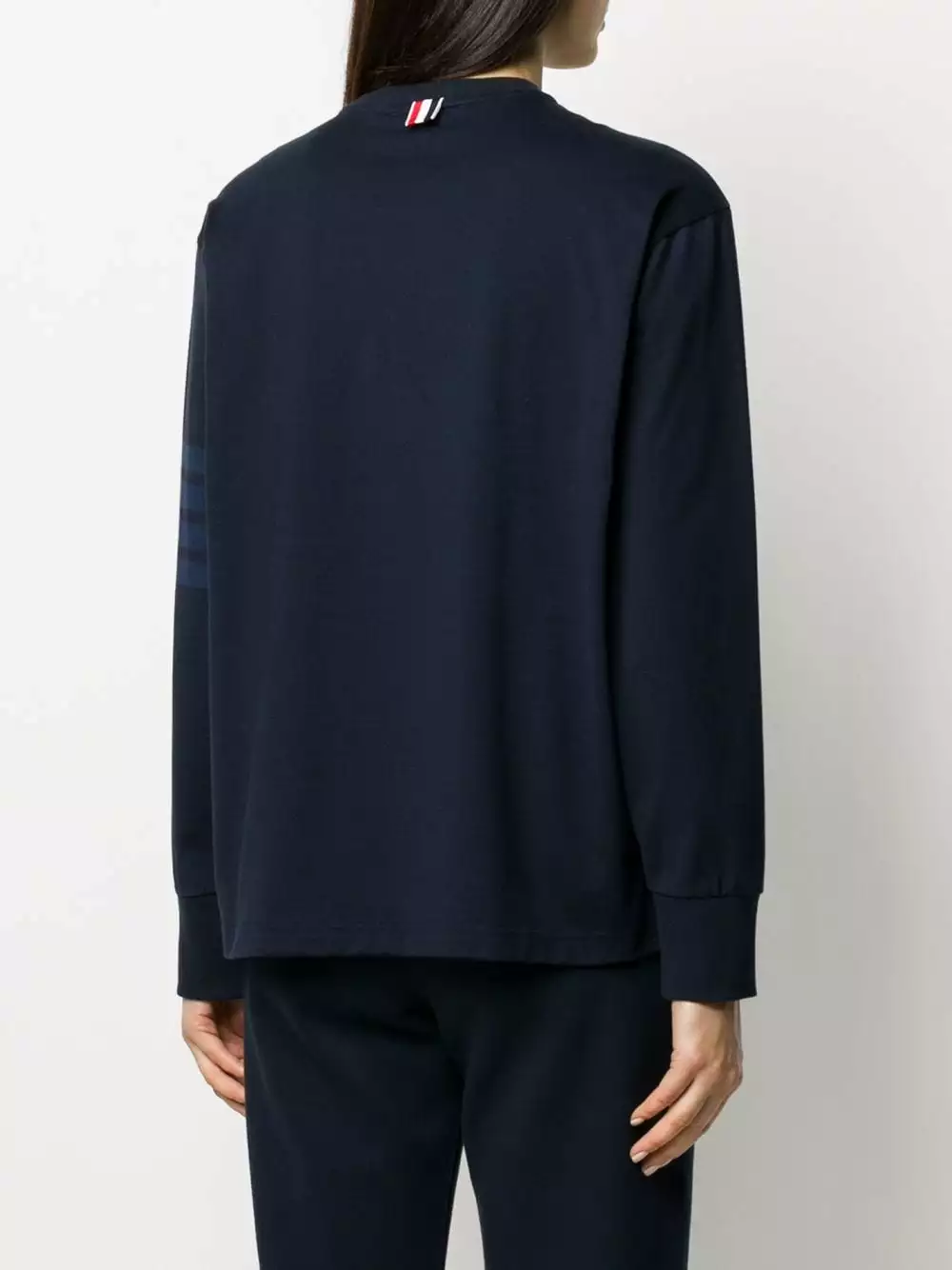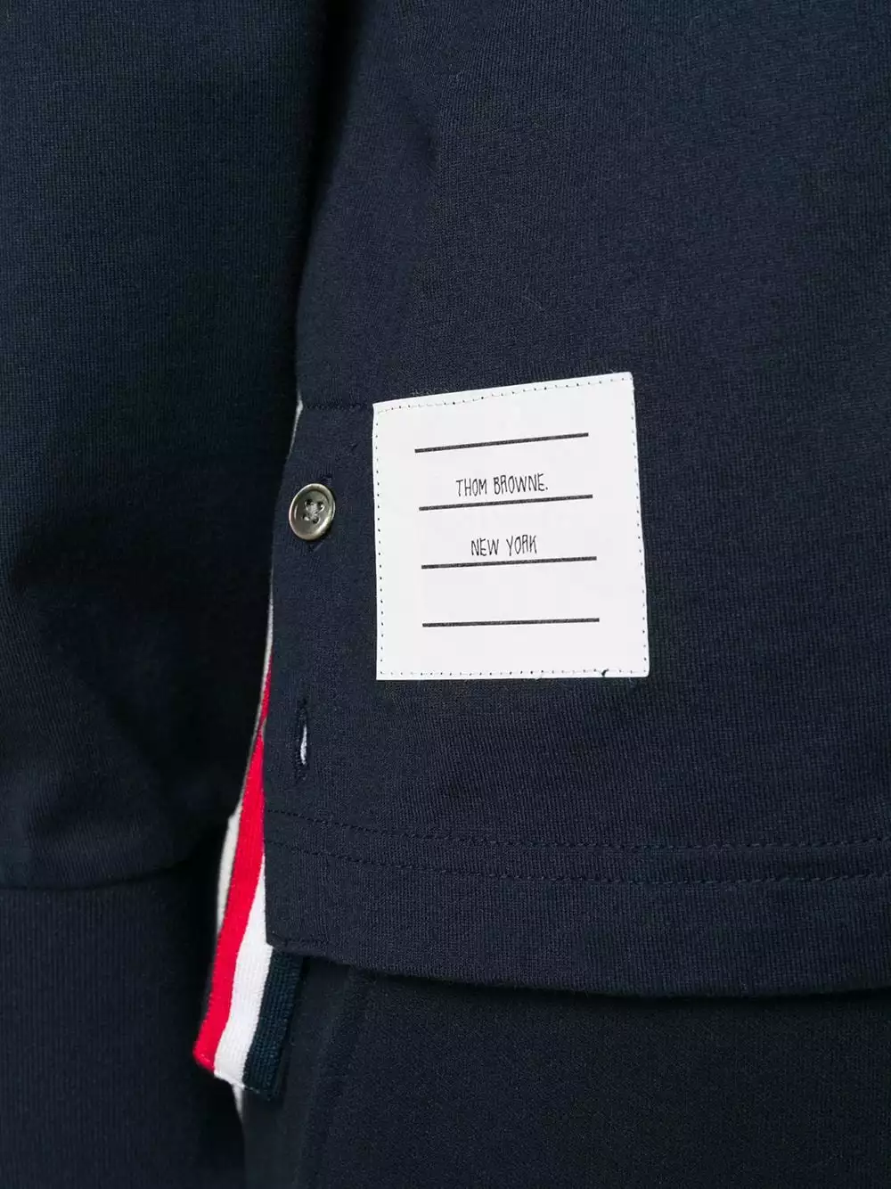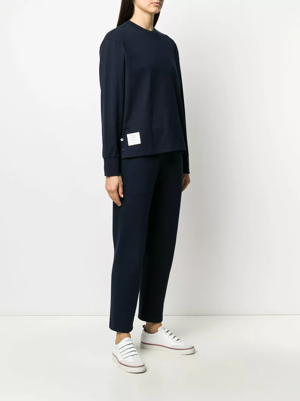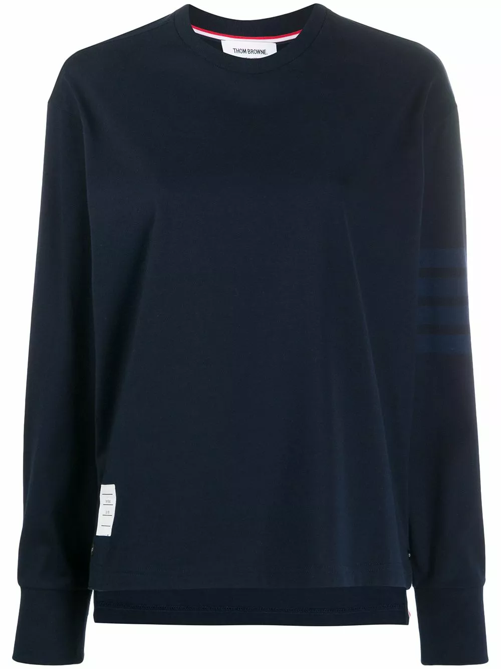 Plain doesn’t have to be a drag – especially in a world where exaggeration prevails. So you can keep up with your minimalist style, throw on this navy cotton long-sleeve rugby tee in medium weight jersey with tonal 4-bar from Thom Browne. You won’t regret it. Featuring a round neck, a straight hem, a logo patch detail on the front and a tricolour grosgrain tab on the rear.