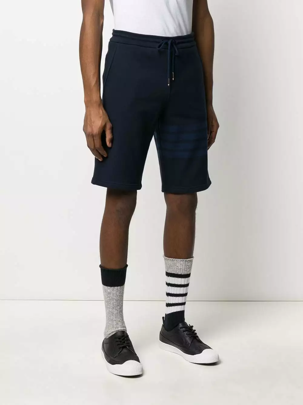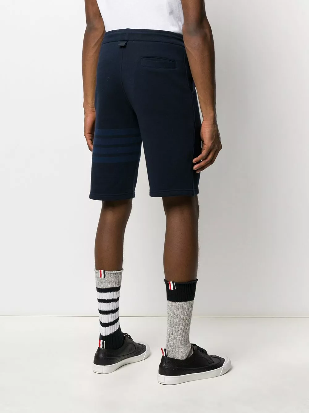 There are two types of people in this world. The weekend gym type and the lounging around type. Whichever type you belong to, these navy cotton loopback 4-Bar track shorts from Thom Browne are for you. The choice is yours. Featuring an elasticated drawstring waist, side slit pockets, a stripe detail to the side, a back pocket and a knee length.