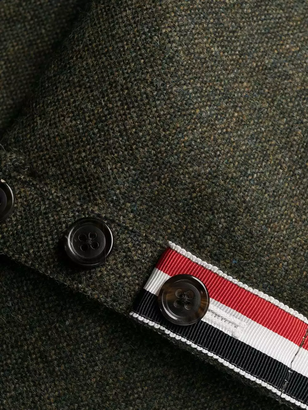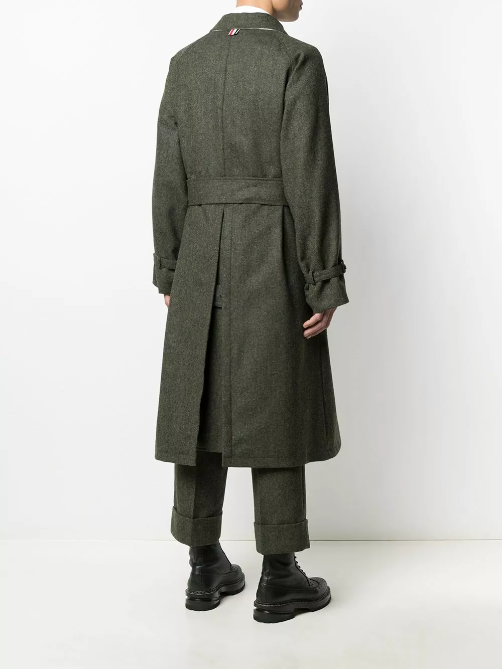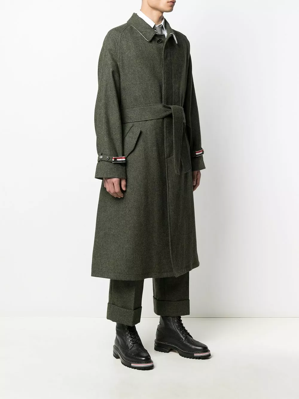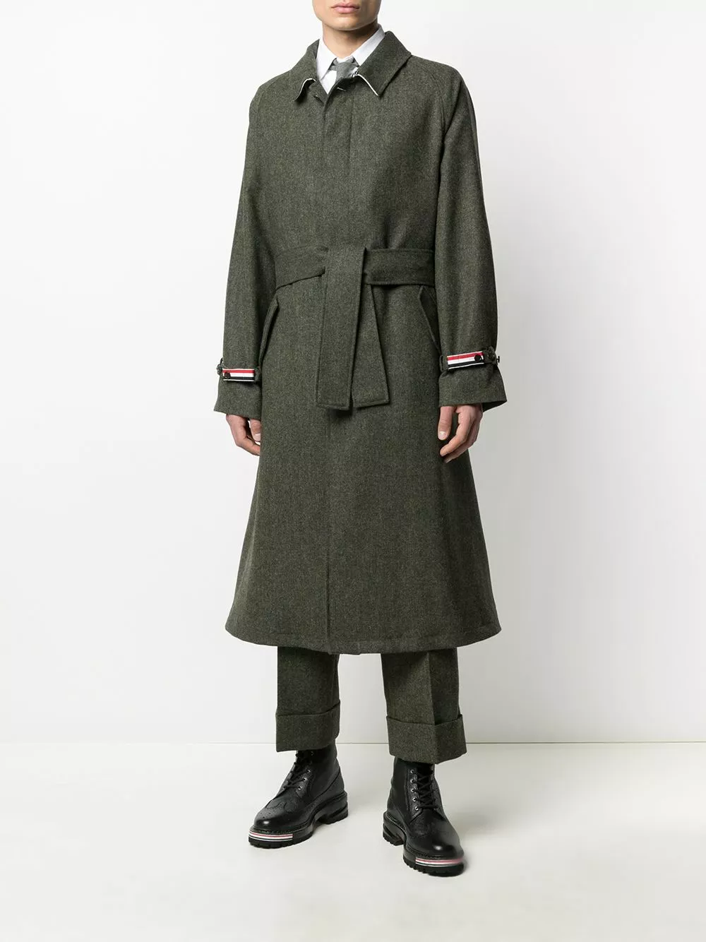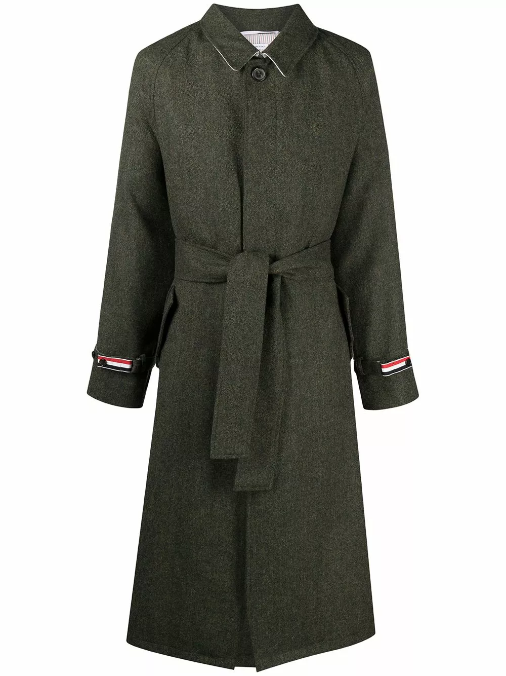 Just because the weather is less than glorious, doesn’t mean that your outfit has to be. In this tie-waist coat from Thom Browne and its dark green hue and wool-blend design, you’re sure to be layered up and looking your best. Wrap up.