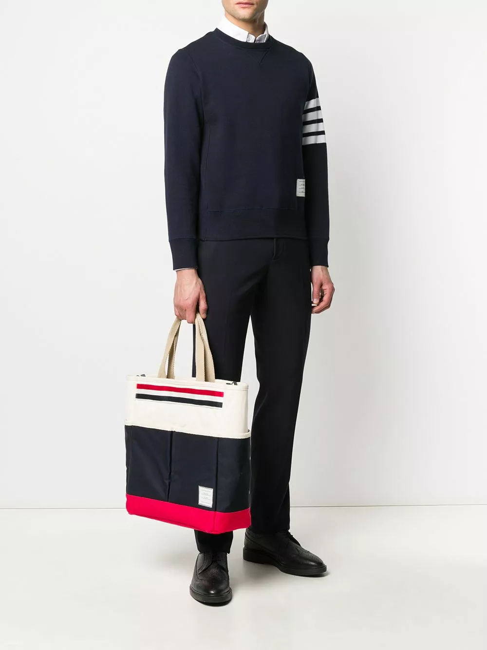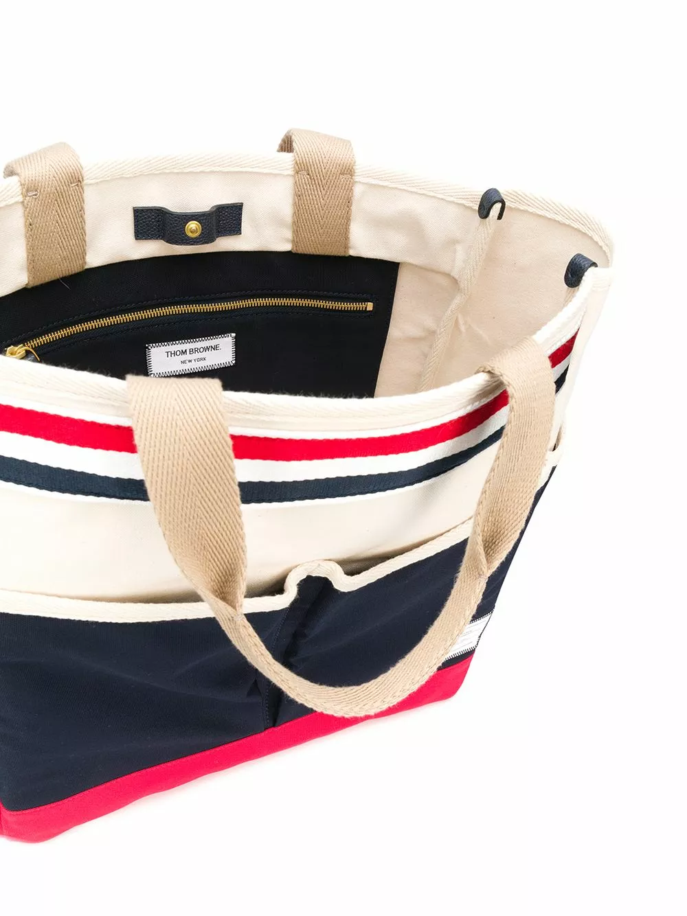 Believe the stripe hype. Made from cotton canvas, this red, off-white and blue garden tote from Thom Browne has been designed with the signature tricolour stripes that we know and love. Featuring top handles, a front logo patch, an internal zipped pocket, pouch pockets, a signature tricolour striped trim, and a brand patch to the back.