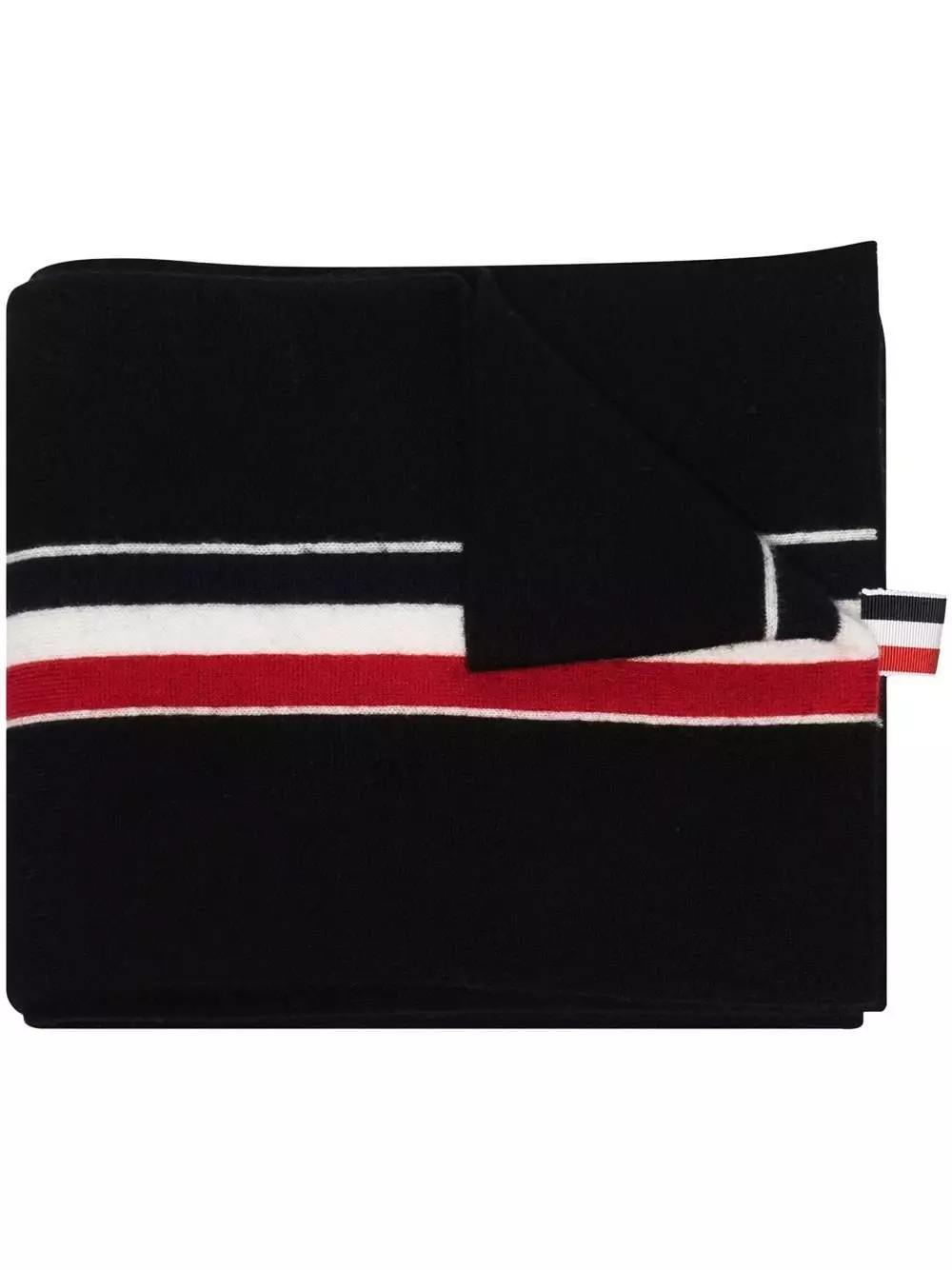 Thom Browne transforms its usually subtle tricolour signature detail into the centre of this knitted scarf. The house’s iconic red, navy blue and white stripes have the blue detail replaced for black, matching a same-colour background.