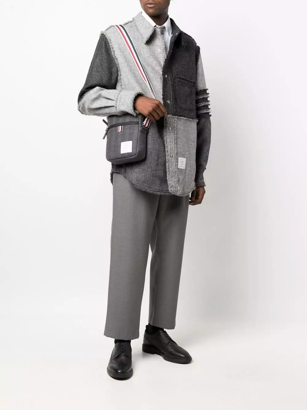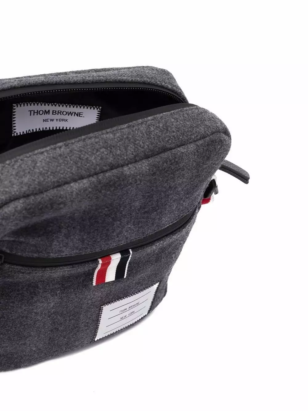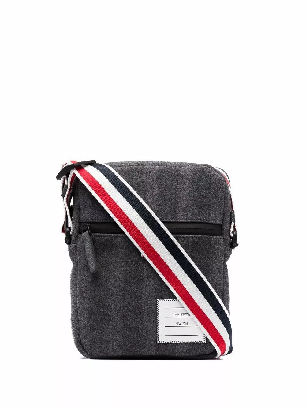 Thom Browne transforms its usually subtle tricolour signature detail into the centre of this messenger bag’s design. The house’s iconic red, navy blue and white stripes is seen here as an adjustable shoulder trap, paired with a grey wool-cashmere blend accessory.