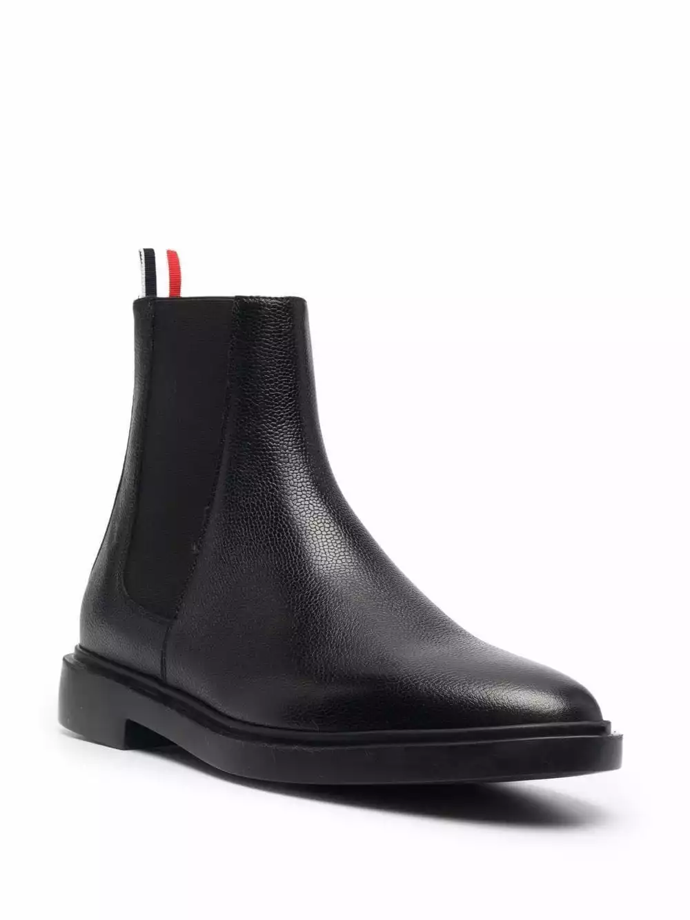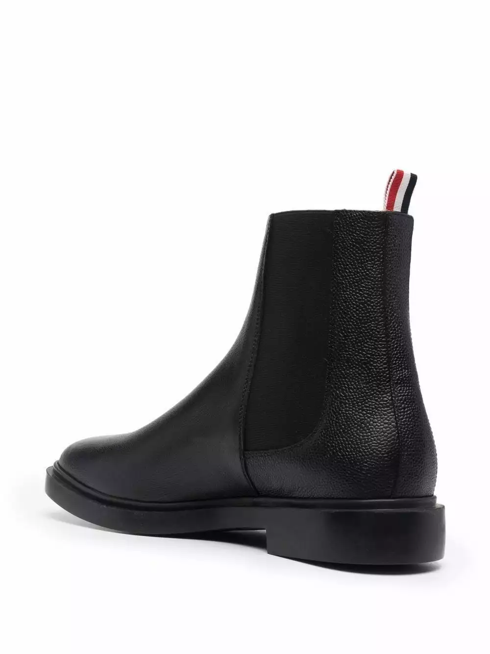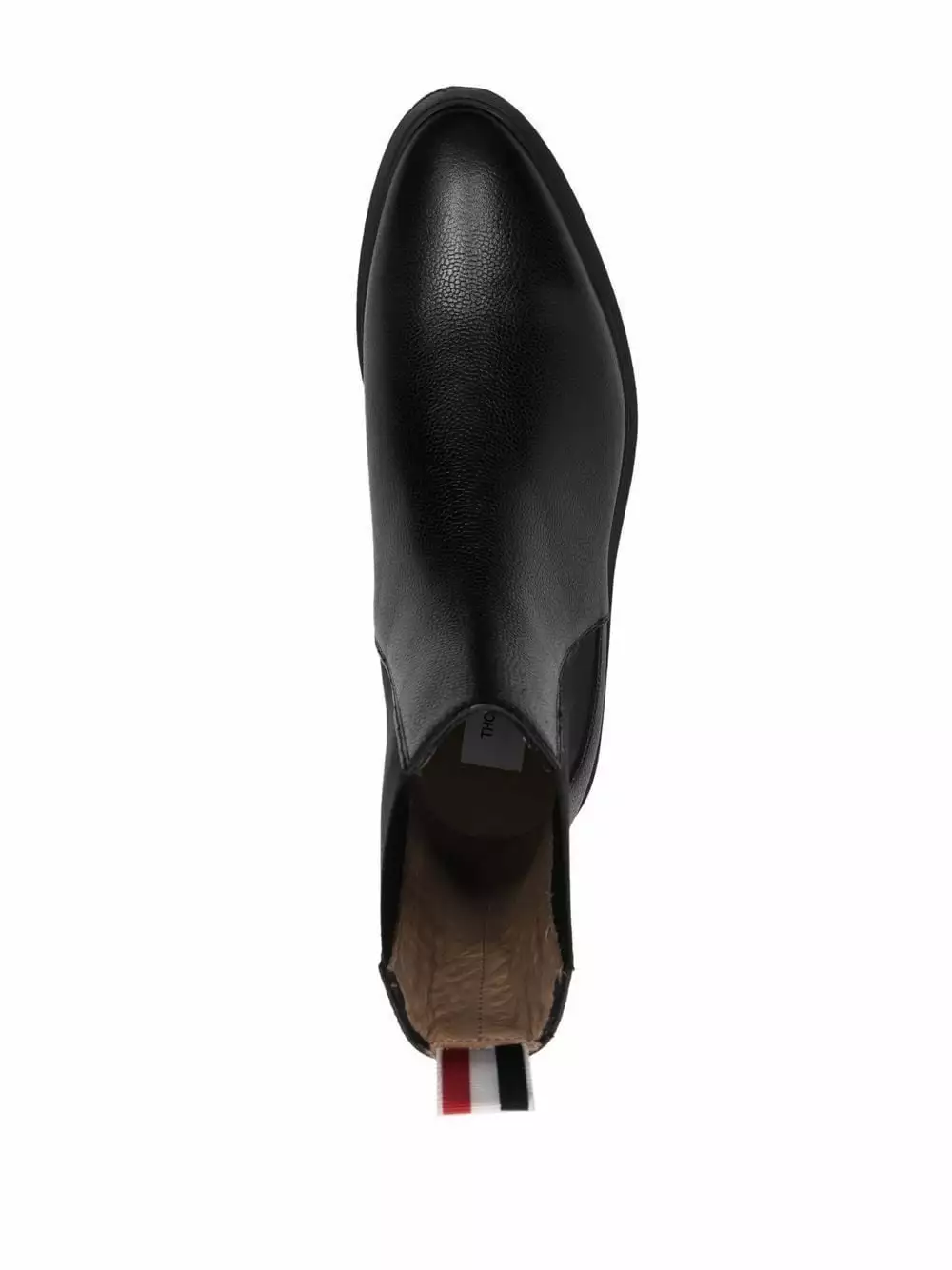 Designed from smooth calf leather, these Chelsea boots from Thom Browne show a traditional design. With the practical slip-on style, the pair has the signature tricolour detail as a rear pull tab.