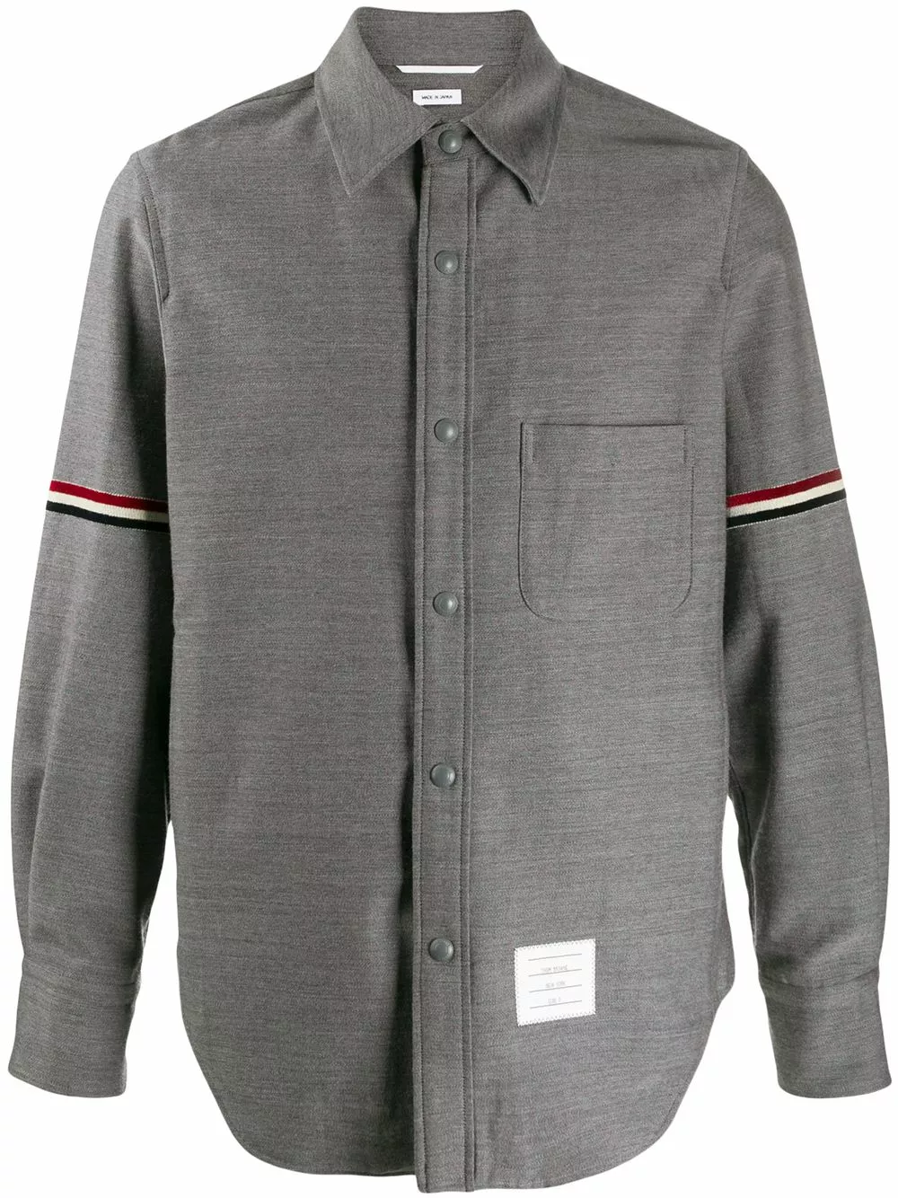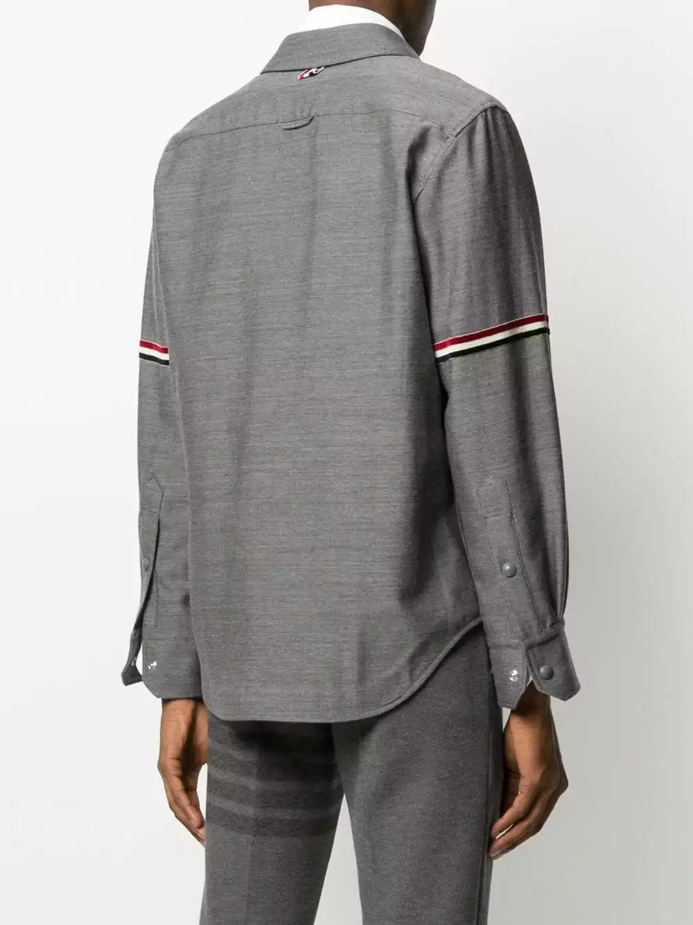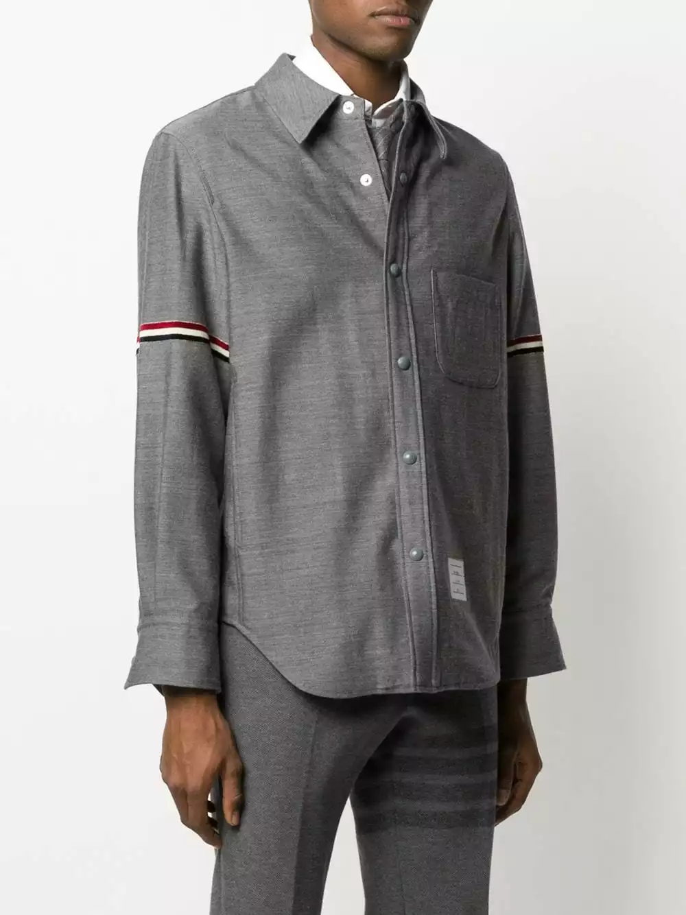 In my life I always ask this question: Am I the most powerful person in the room? With this medium grey wool-cotton blend suiting tricolour velvet stripe shirt jacket from Thom Browne you will be. Why fight it. Featuring a pointed collar, long sleeves, a chest pocket, a curved hem, snap button fasteners, a tricolour grosgrain tab on the rear and tricolour grosgrain details at the sleeves.