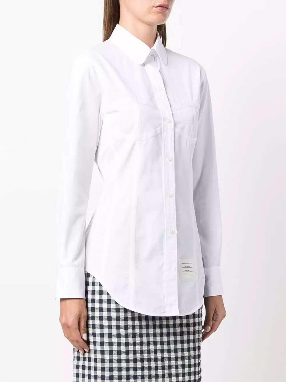 Preppy style meets the playful energy of Thom Browne. Made from white cotton, this button-up shirt is reimagined with a corset detail and a logo patch on the front.