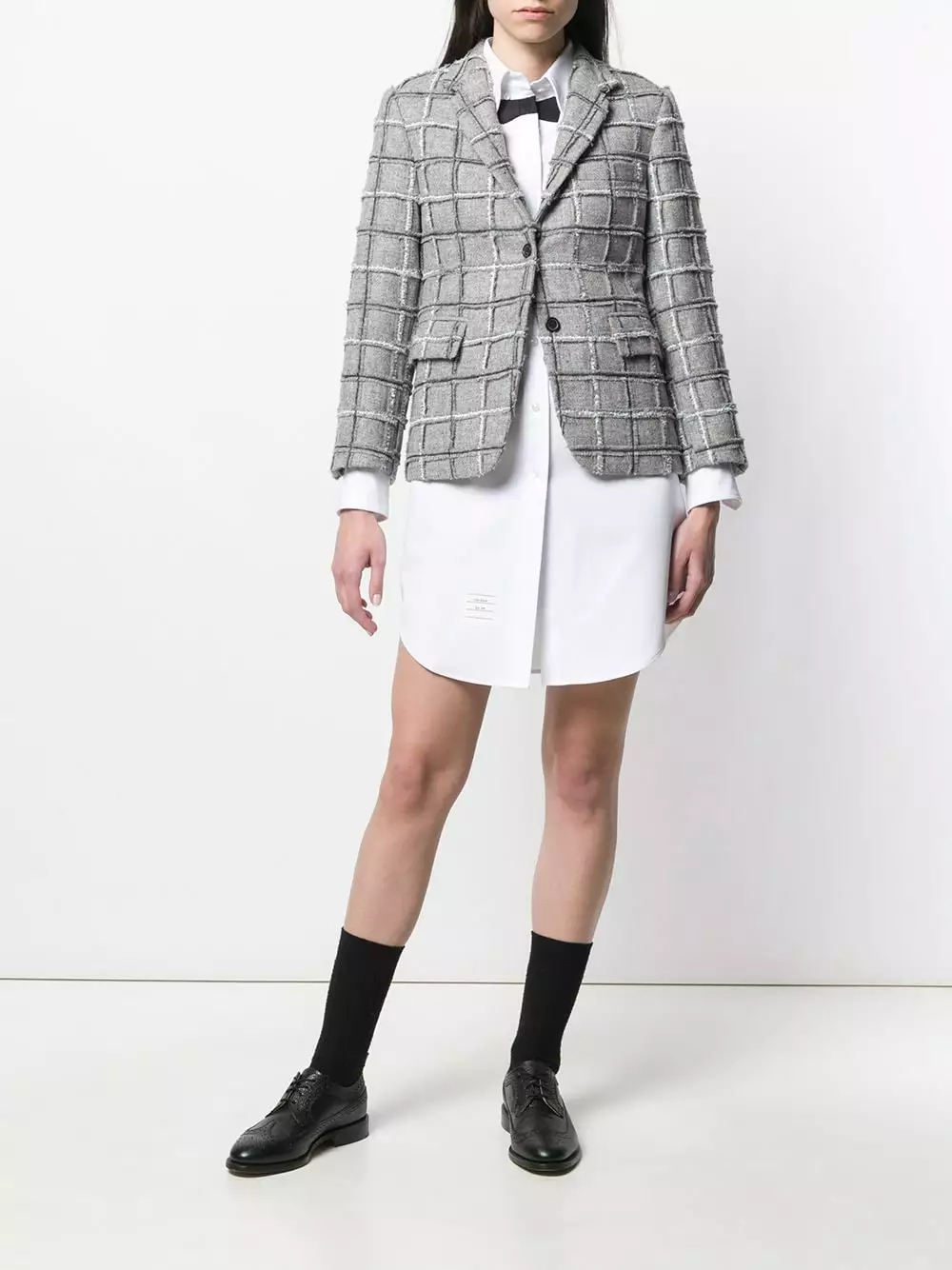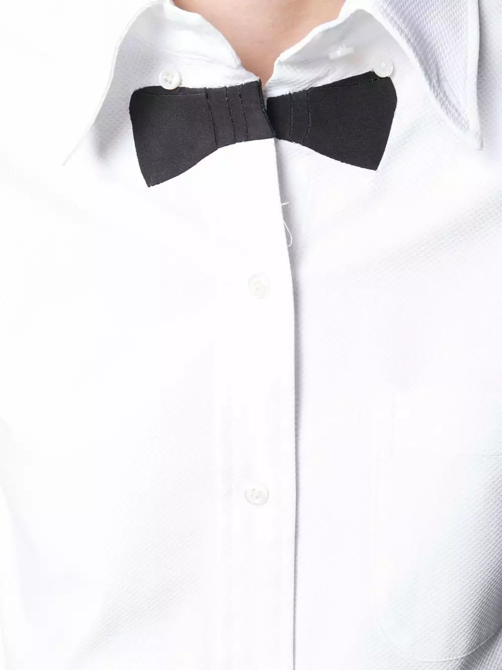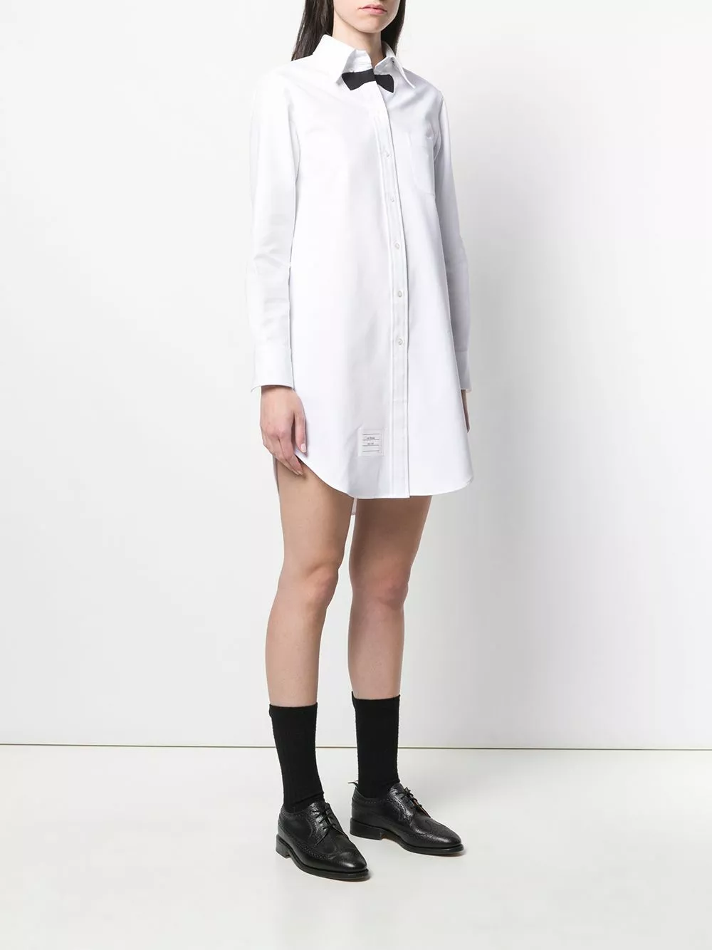 Do you like to be just that little bit different? Then you’ll want to go for this bow tie print white shirt dress from Thom Browne. Pull it on and stand out. Featuring a classic collar, a front button fastening, long sleeves, button cuffs, a chest pocket, a front logo patch, a curved hem, a short length and a bow tie print.