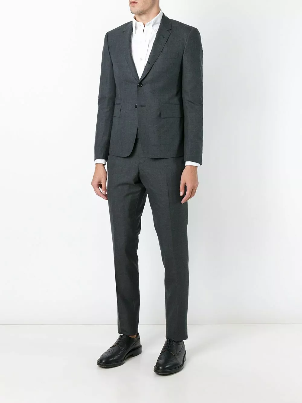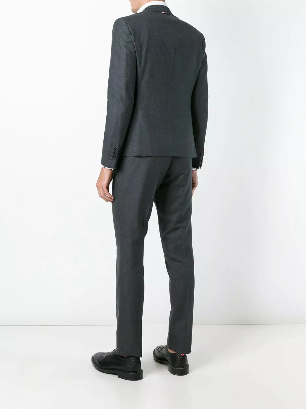 This grey suit bears all the hallmarks of Thom Browne, its single breasted silhouette crafted in a luxurious mohair blend wool. The jacket fastens with three buttons and is finished with notched lapels, welt pockets, buttoned cuffs, double vent and a striped tab to the rear, while the interior is fully lined with a striking striped fabric. The trousers take a straight cut, topped with a waistband, concealed fastening, side pockets, buttoned welt pockets and a tri-stripe patch.