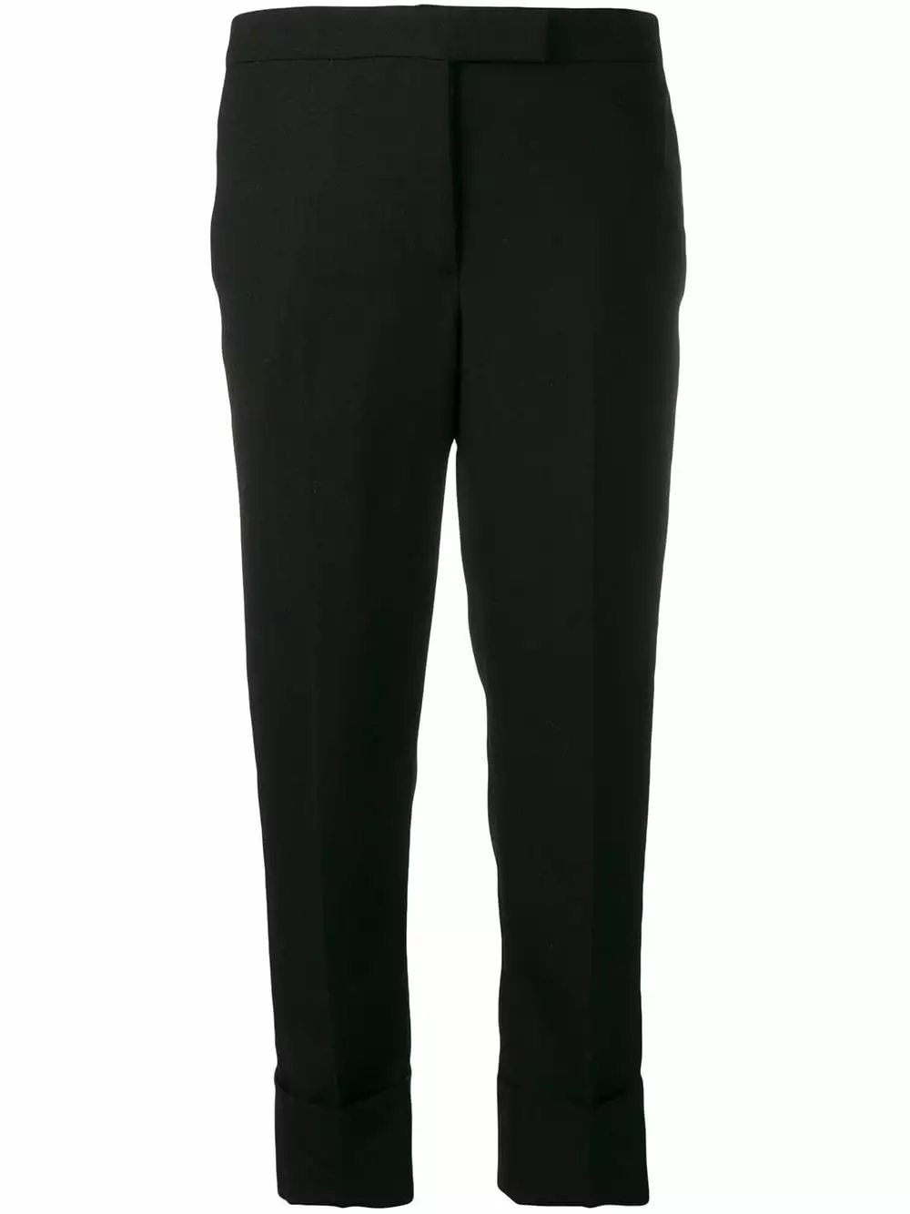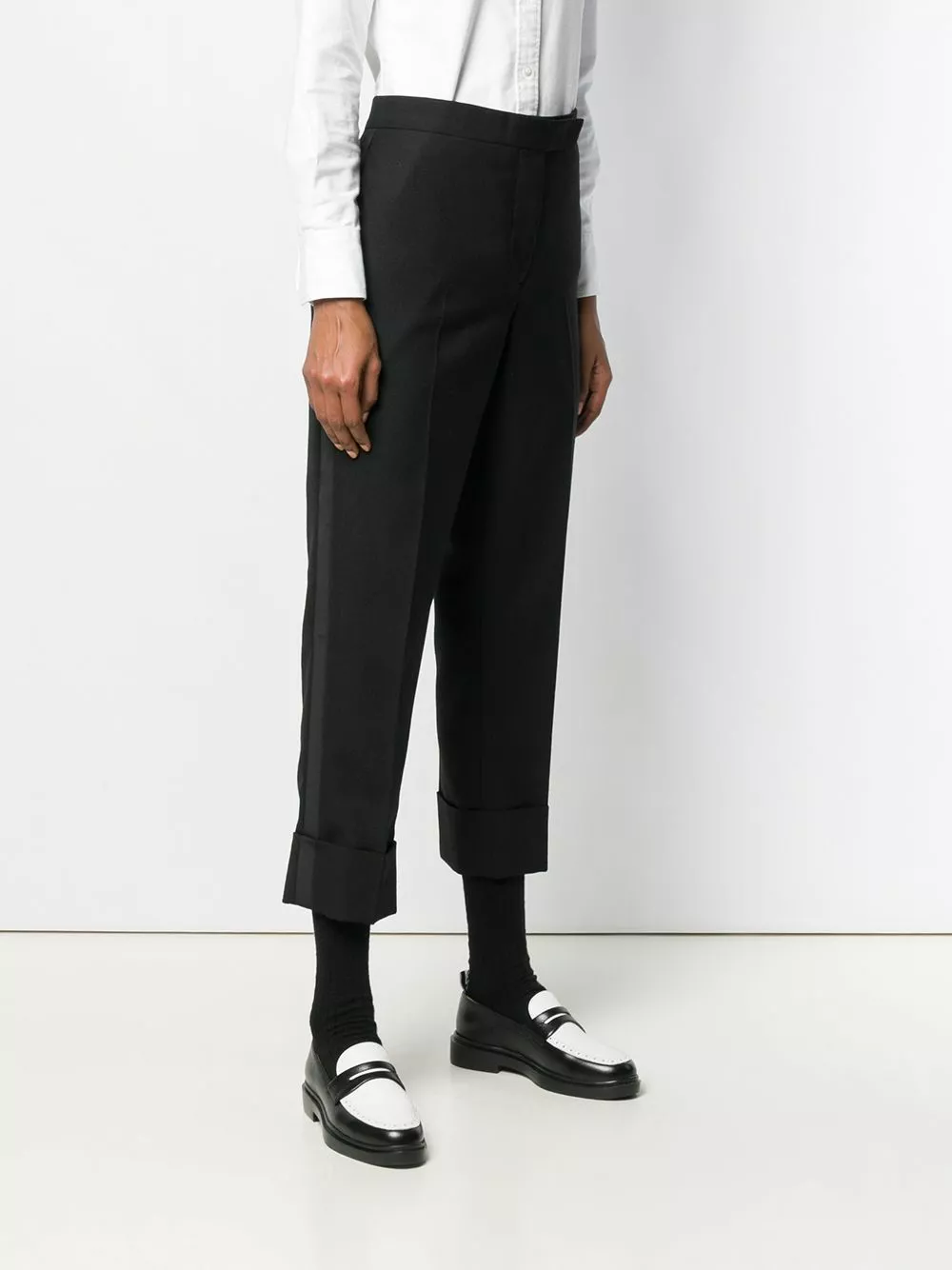 Since its launch in 2003, Thom Browne’s namesake label has gained notoriety for its clean designs and use of luxury materials, as showcased by these black backstrap trousers with a tuxedo stripe in 2Ply Fresco. Featuring a concealed front fastening, side pockets, two back buttoned welt pockets, turn up hems, pleated details, a cropped length and a tricolour grosgrain tab on the rear.