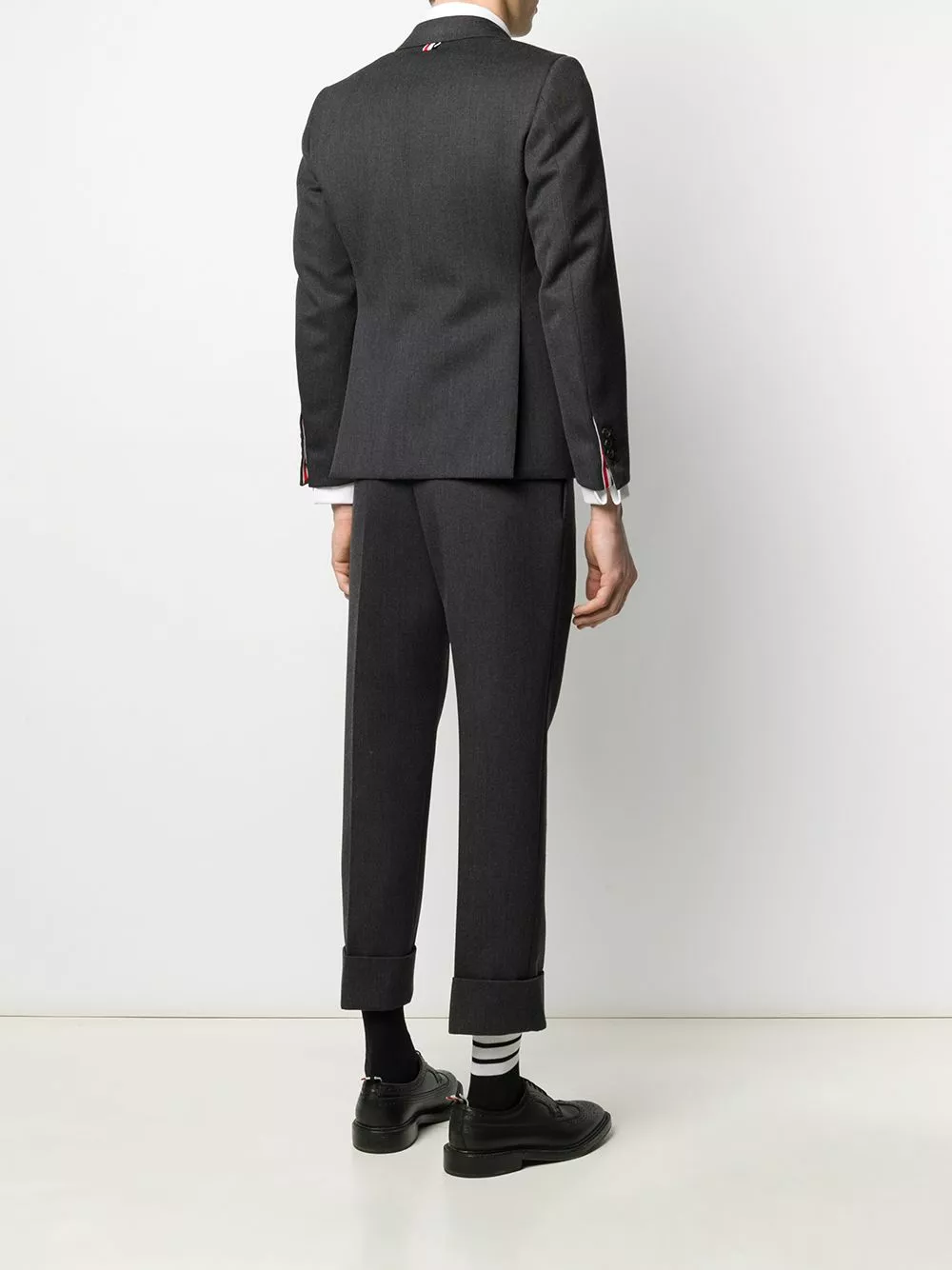 Thom Browne transforms classic silhouettes by adding signature detailing that gives the brand that avant-garde edge. Case in point: this two-piece formal suit. Crafted from super 120s wool twill, this structured yet comfortable suit is trimmed with the signature three-stripe tab to the back and has cropped turned-up cuffs to the trousers. Jazzy socks encouraged.