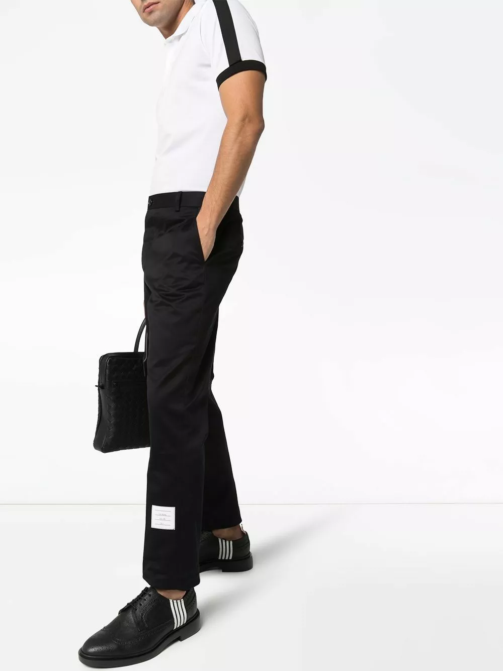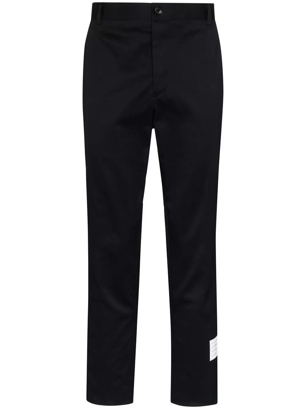 Always favouring clean lines and signature house elements, Thom Browne presents these navy blue chinos. Made from cotton, this slightly cropped pair is detailed with the label’s recognisable grosgrain loop tab to the rear and a logo patch to the side.