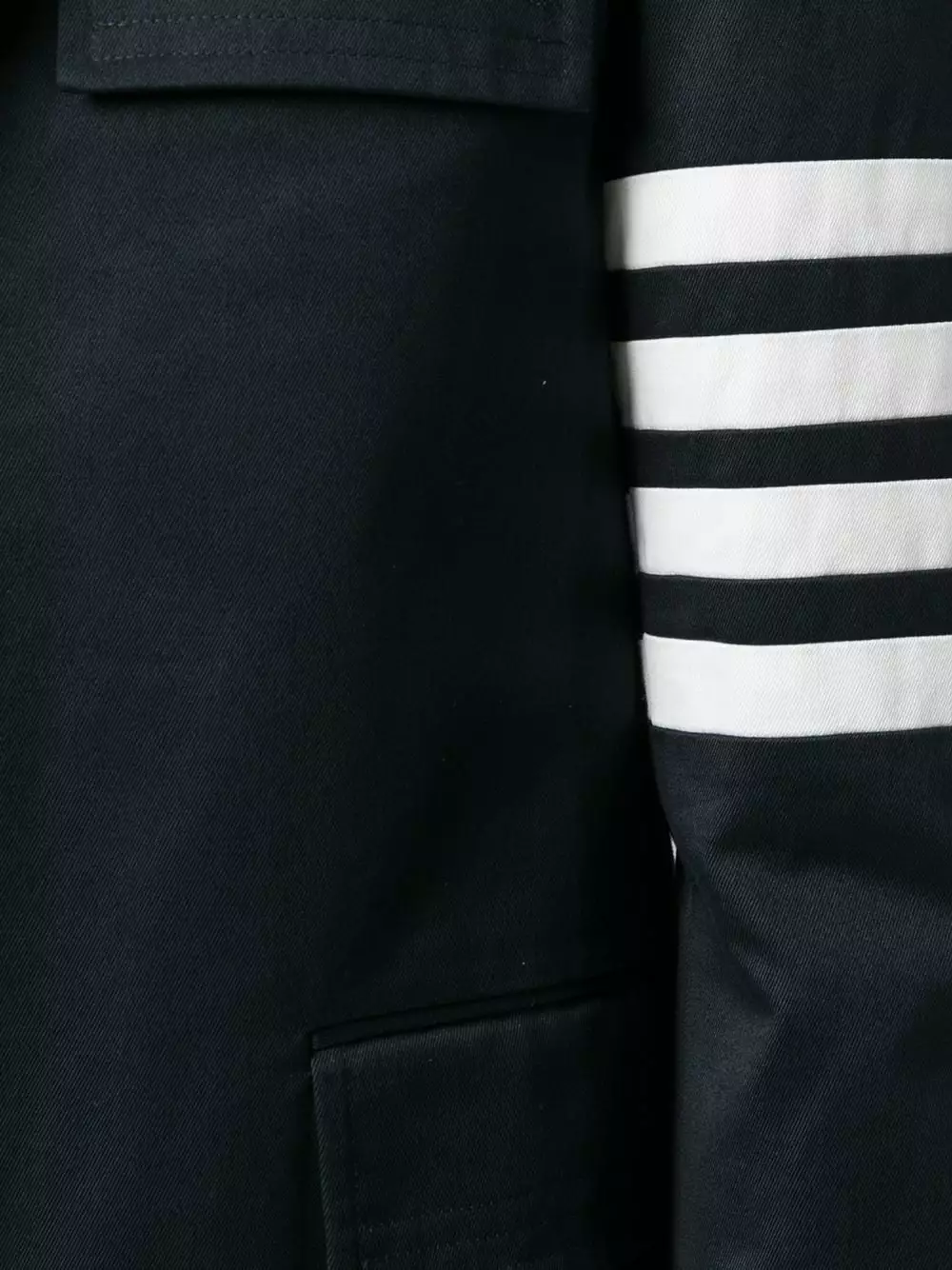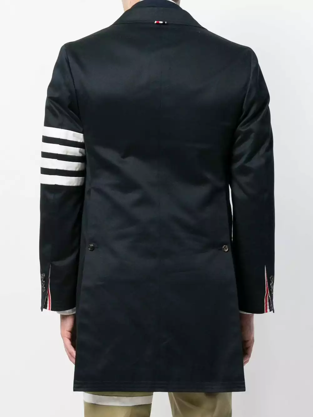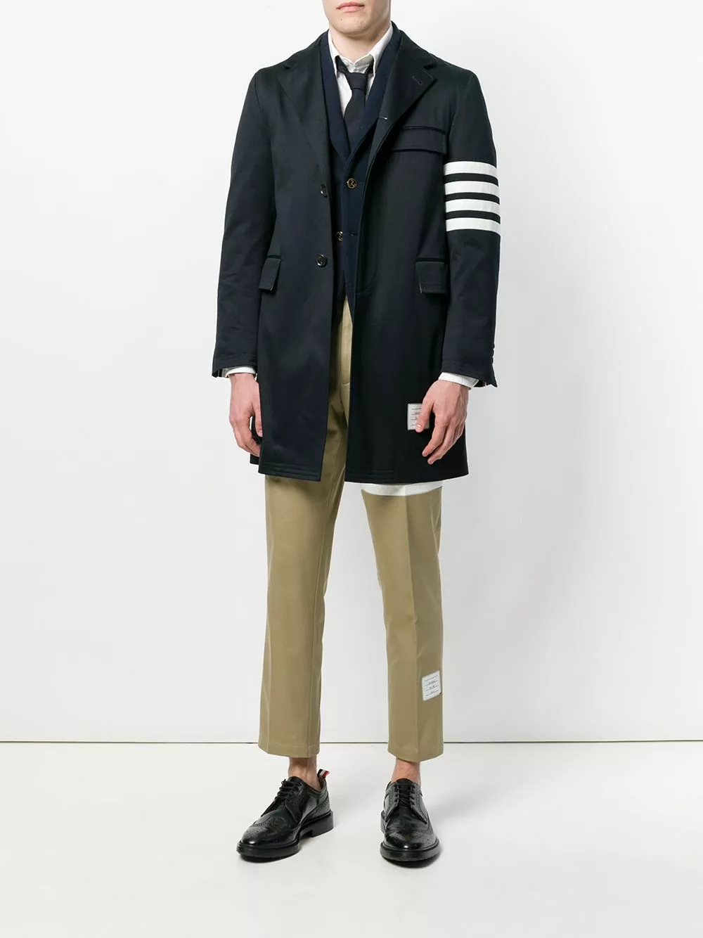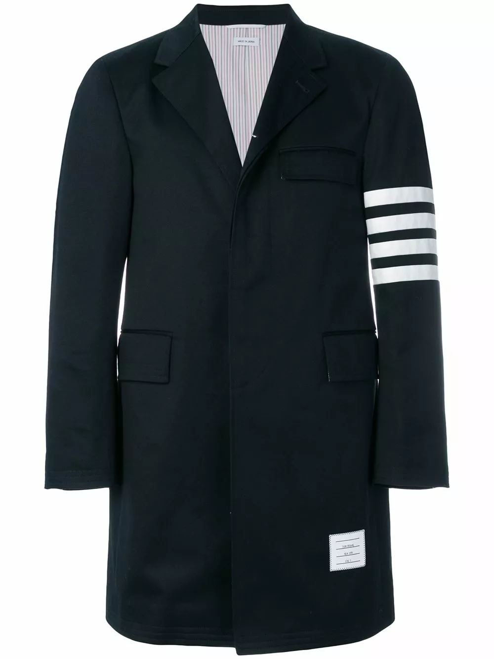 Combining highest-quality fabrics and a conservative sensibility with a touch of irreverence and humour, Thom Browne’s Autumn/Winter 2018 is full of modern must-haves. Crafted in Japan from navy blue cotton accented with sporty stripes at the left arm, this immaculately tailored slim-fit coat features classic notched lapels, a concealed front button placket, cropped sleeves with button cuffs, a trio of front flap pockets, plus a double back vent to the rear and a striped lining ensuring a proper drape. Thoughtful details like front logo patch, a tricolour grosgrain tab to the rear and matching striped trims peeking from under the cuffs ensure a bold yet timeless look that’s bound to last beyond the season.