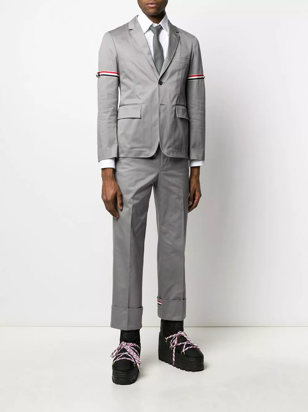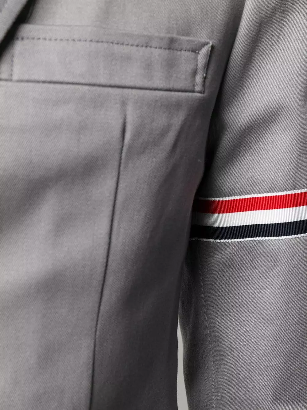 Don’t be afraid to stand out from the crowd. Dare to be different with this cotton unconstructed grosgrain armband sport coat from Thom Browne. Its red, white and blue stripes add a sporty and casual finish to this tailored design – making it a unique addition to your wardrobe. Featuring notched lapels, a button fastening, cropped sleeves, flap pockets and RWB stripes.