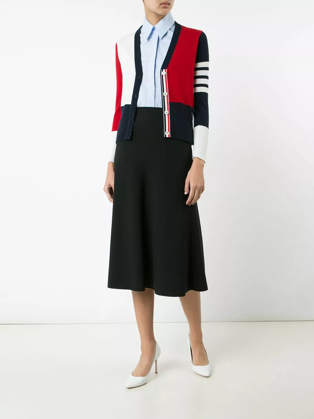 As renowned for his beloved knitwear as he is for his boundary-pushing tailoring, this knitted cardigan finds Thom Browne editing a familiar favourite with more athletically-inclined detailing. Crafted in the United Kingdom from soft cashmere, this sophisticated cardigan features a v-neck, a front button fastening, long sleeves, button cuffs, a ribbed hem and cuffs, 4-bar stripes at the sleeve, red, white and blue grosgrain cuffs detail and back yoke tab and side buttoned slits.
