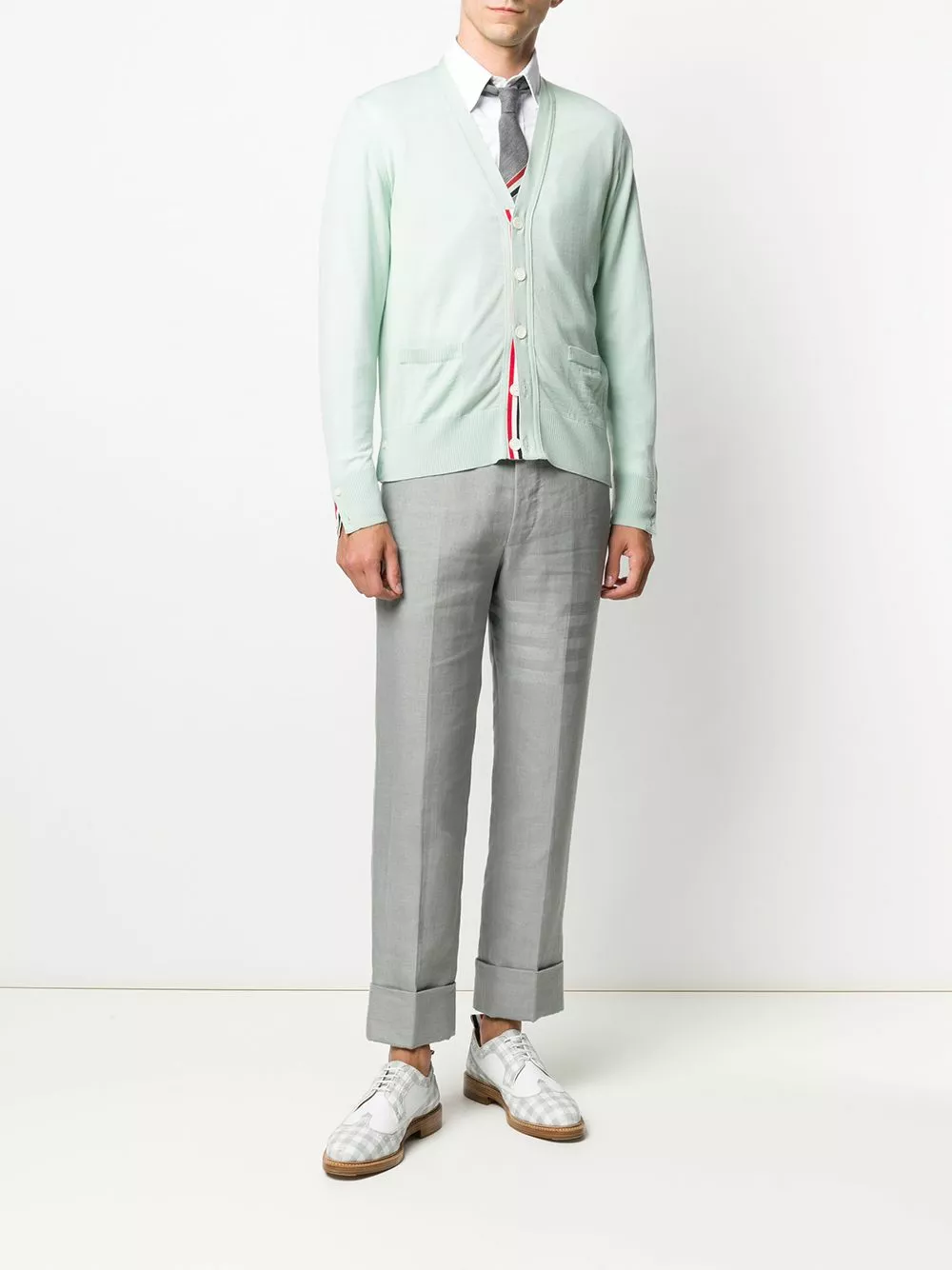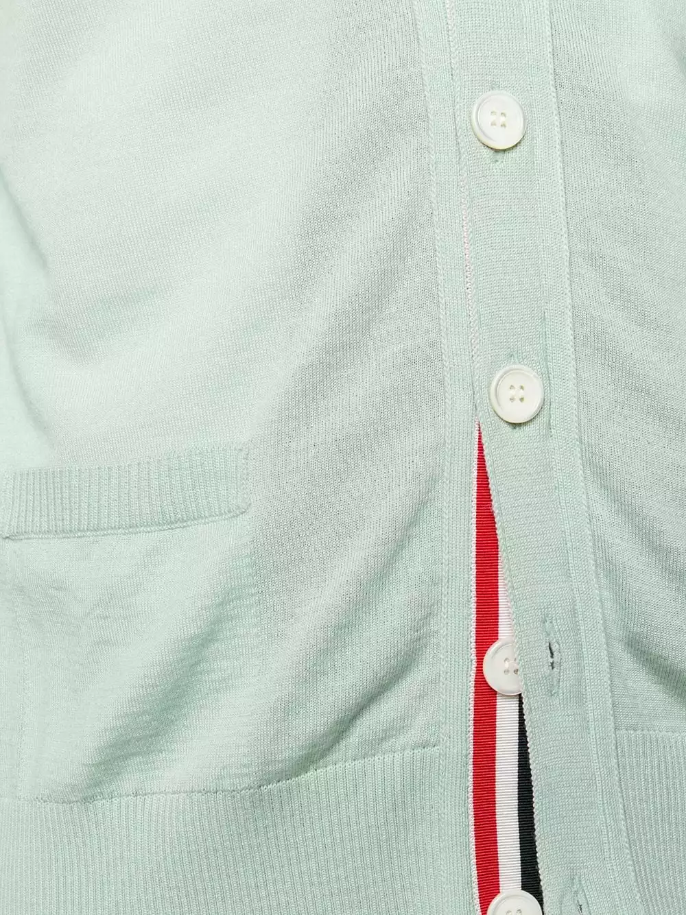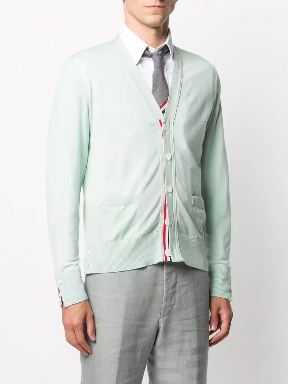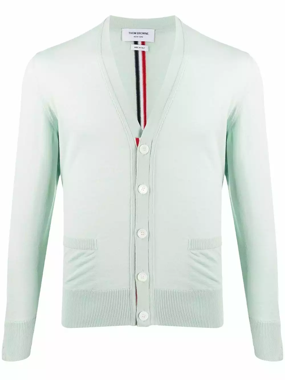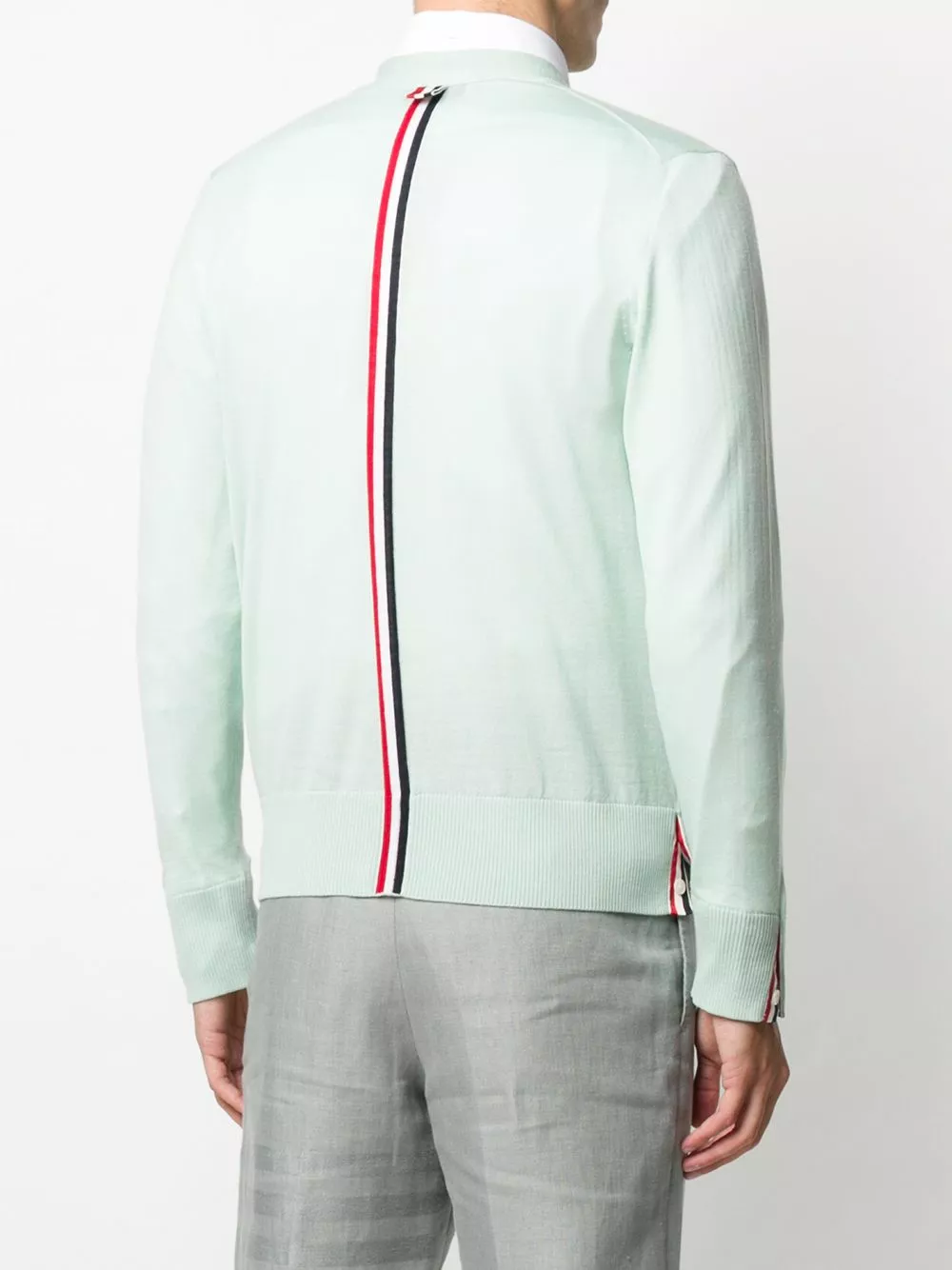 Thom Browne proves that it’s all in the detail with this V-neck merino wool cardigan. Designed with a signature tricolour stripe trim to the back and front button placket, this classic knit is just the thing to complete your layered look.