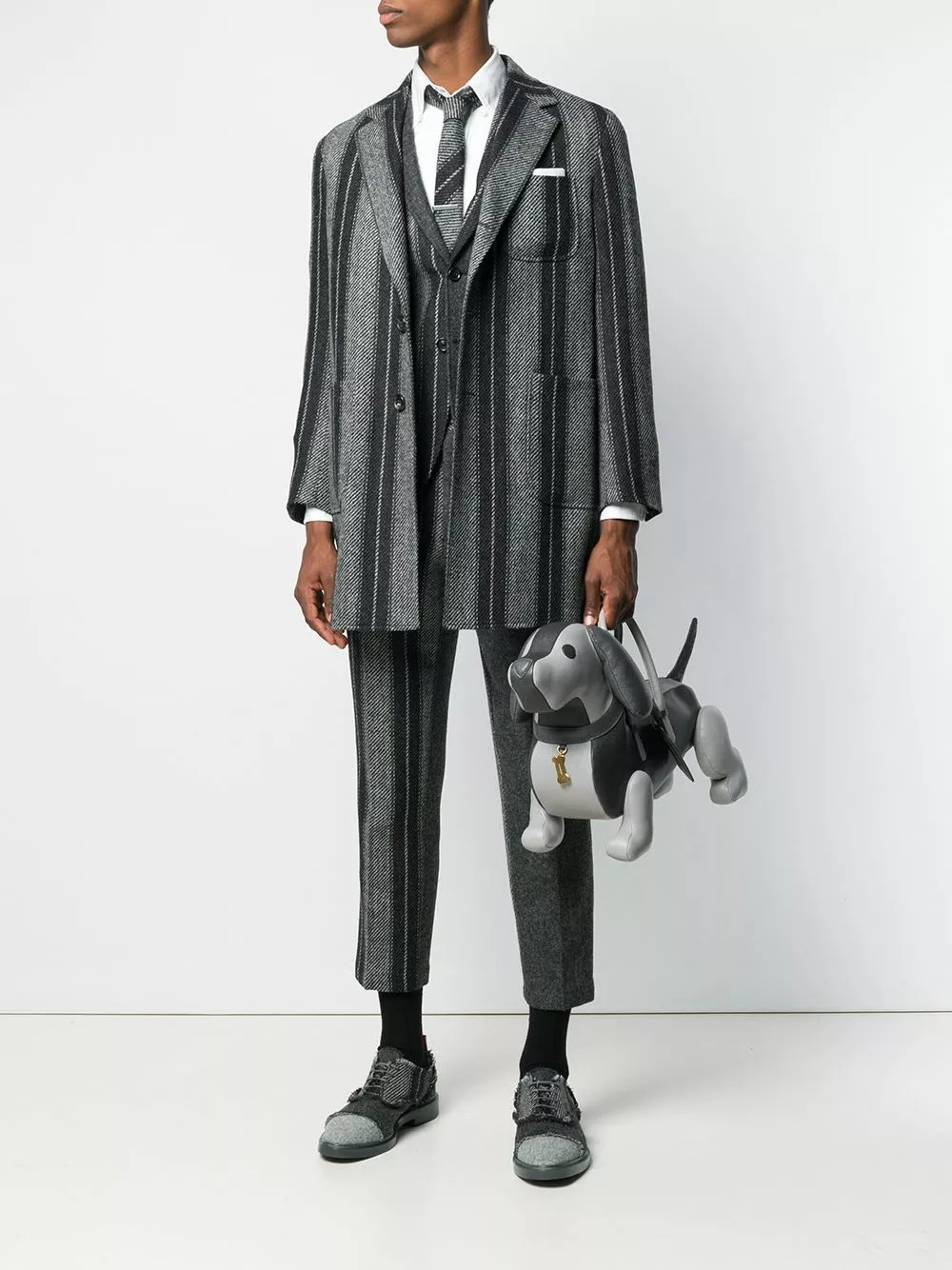 A lineup of investment pieces designed to withstand the test of time, Thom Browne’s most recent collection continues to blur the lines between refined tailoring and contemporary sportswear, as showcased by these medium grey wool Variegated Repp Fun Mix Shetland Chino. Featuring belt loops, a front button fastening, two back buttoned welt pockets, a cropped length and a slim fit.