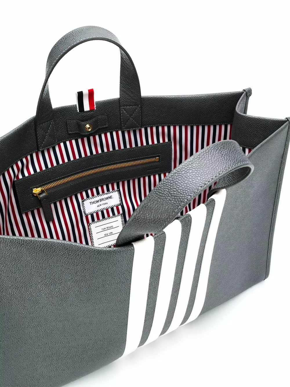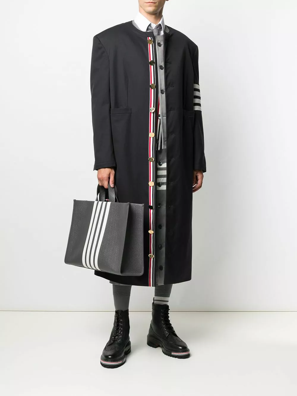 Earn your stripes, with this striped rigid tote bag from Thom Browne. The structured design is a suave take on a masculine tote bag and will provide you with spacious storage that you can sport with style.
