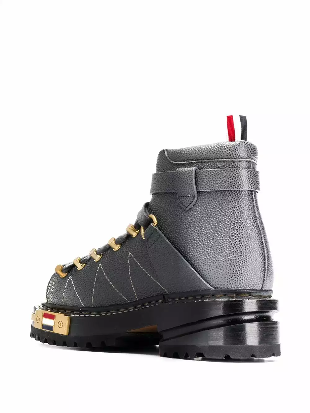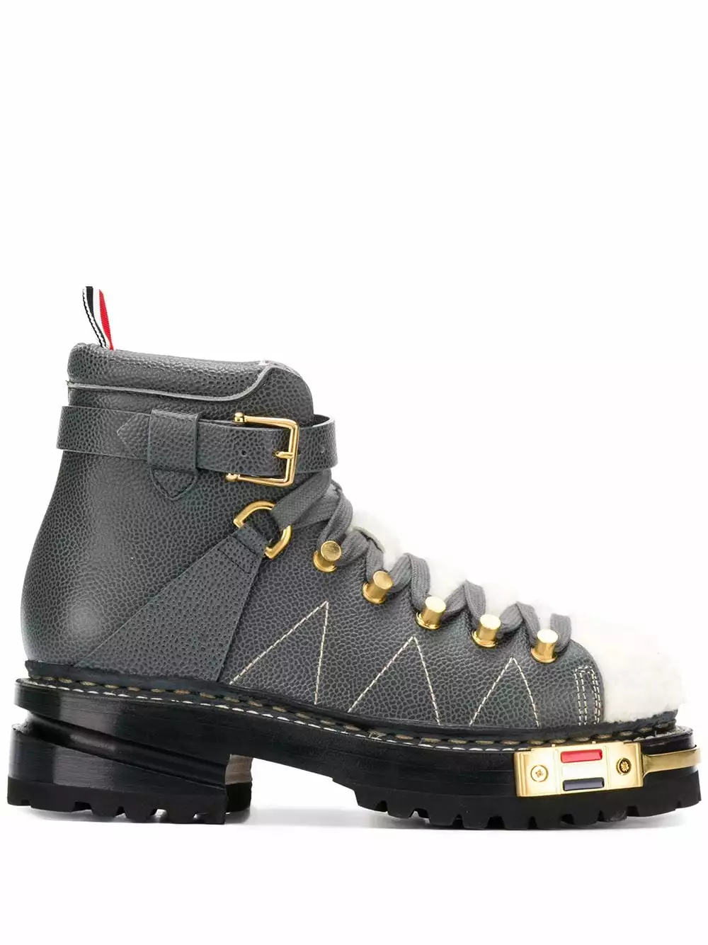 You may not be hiking Mount Fuji, but at least you can look the part albeit a bit more stylish. These grey leather Vitello hiking boots from Thom Browne are a real sight to behold, with a lace-up front complete with hiking hooks. Put your best foot forward! Featuring a pull tab at the rear, a lace-up front fastening, an ankle strap with a side buckle fastening, a ridged rubber sole, gold-tone hardware and a signature tri-colour tab.