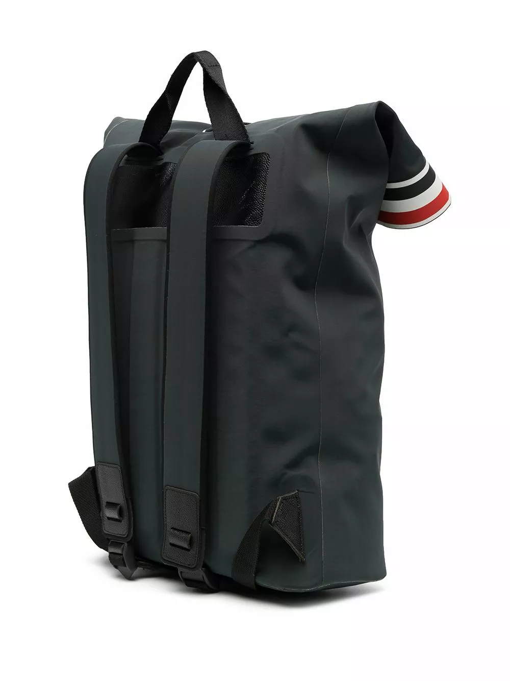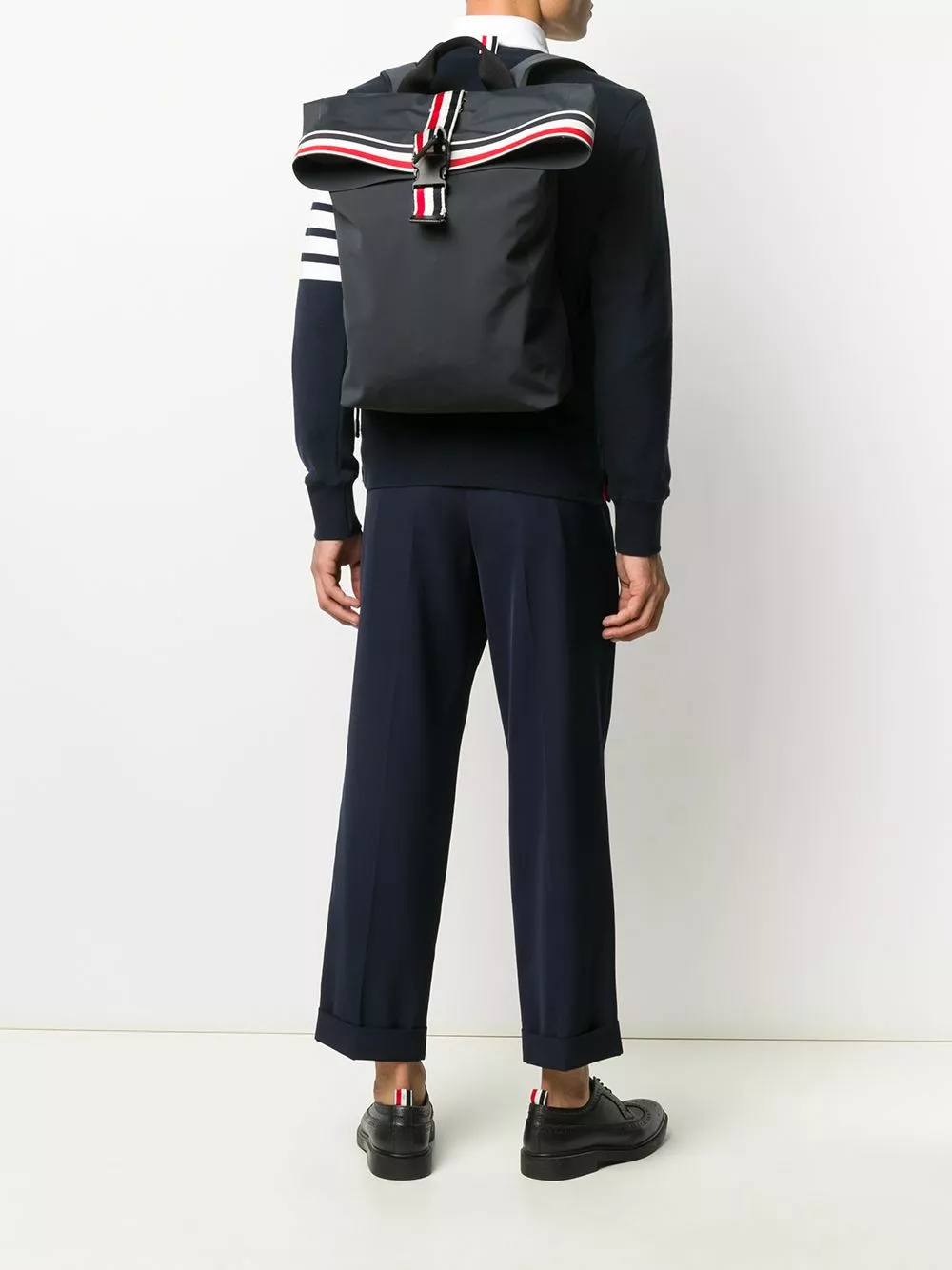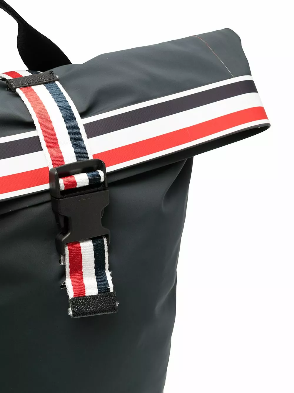 Looking for a backpack that’s slightly different from the others? Try this dark grey backpack from Thom Browne. The welded foldover top and RWB stripes will make sure you are noticed. Don’t be shy. Featuring a foldover top, a buckle fastening, a main internal compartment, a top handle, adjustable shoulder straps, a leather trim and signature RWB stripes.
