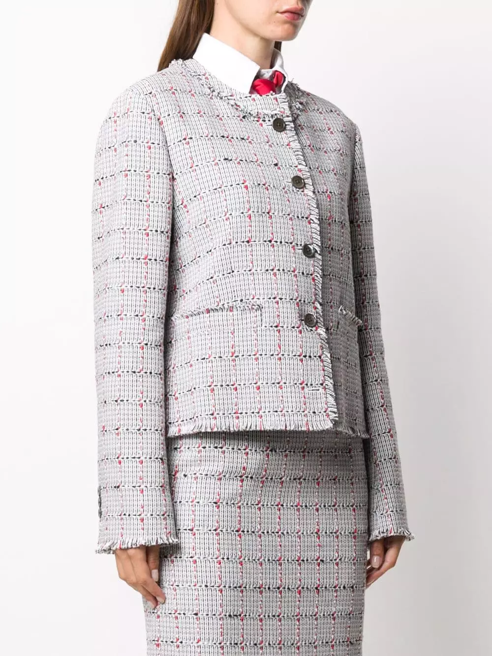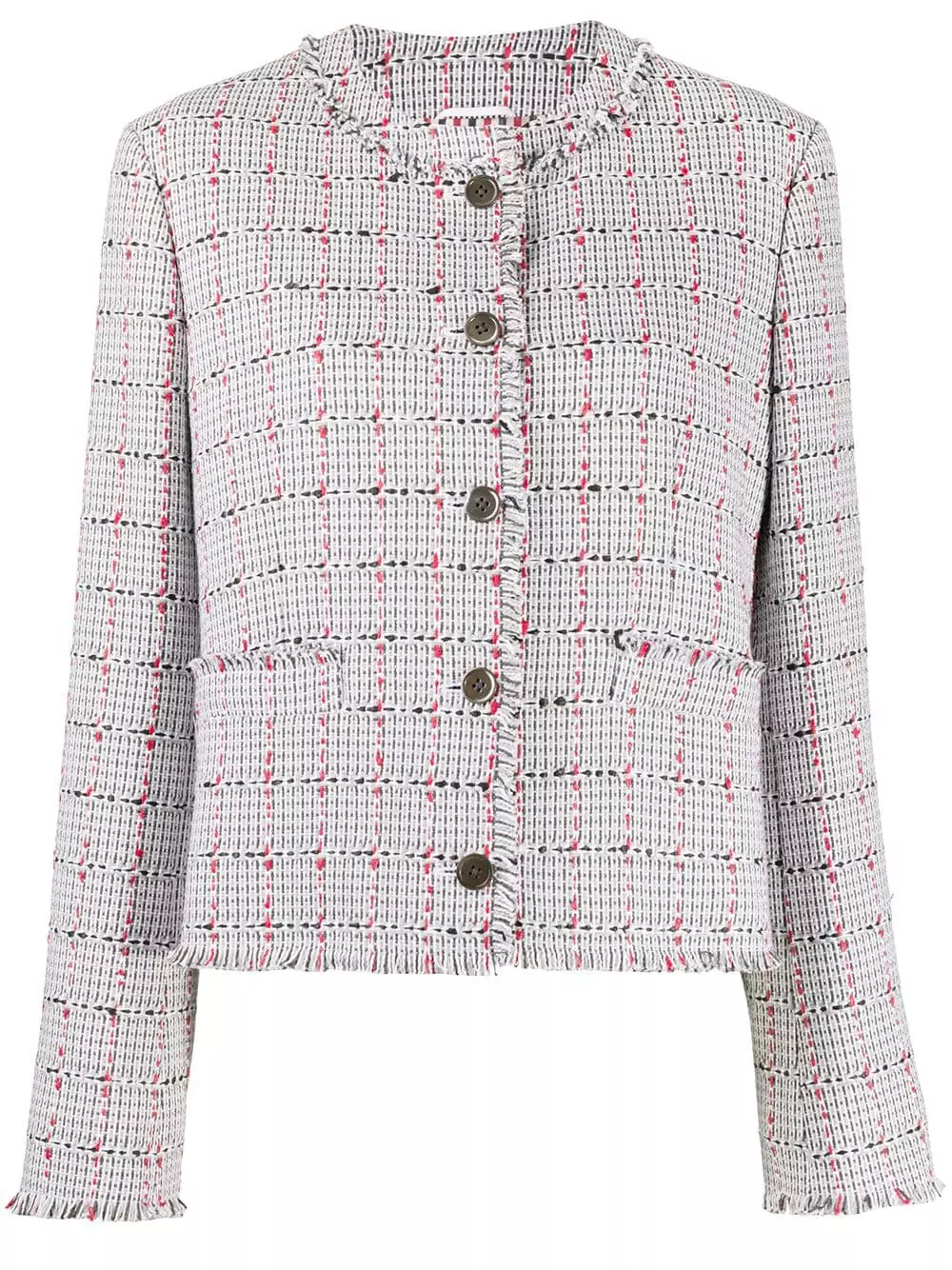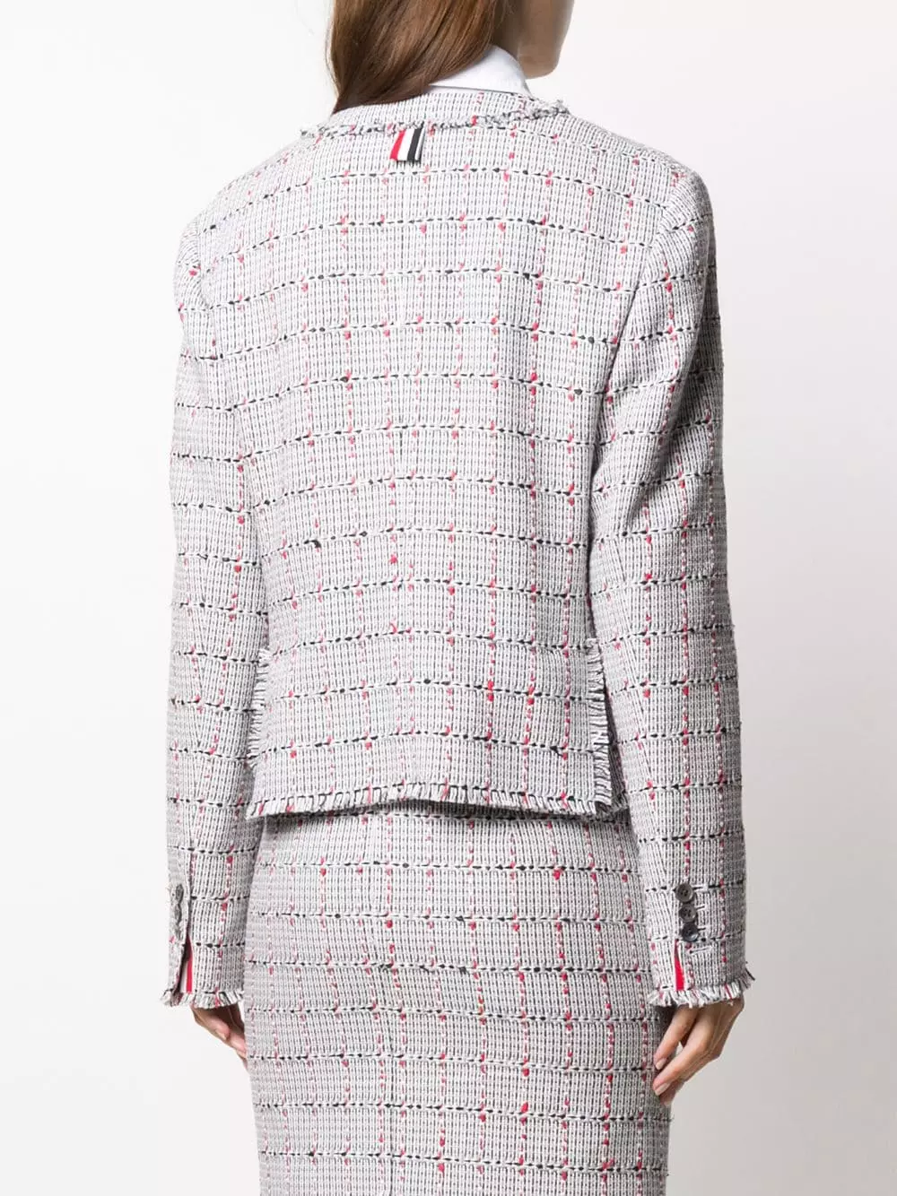 They say that eyes are the windows to the soul, but this windowpane check blazer also shows your true stripes – they’re tricolour and from Thom Browne. Crafted from cotton tweed, featuring a round neck with frayed edges. Found a jacket that goes with every outfit? Check.