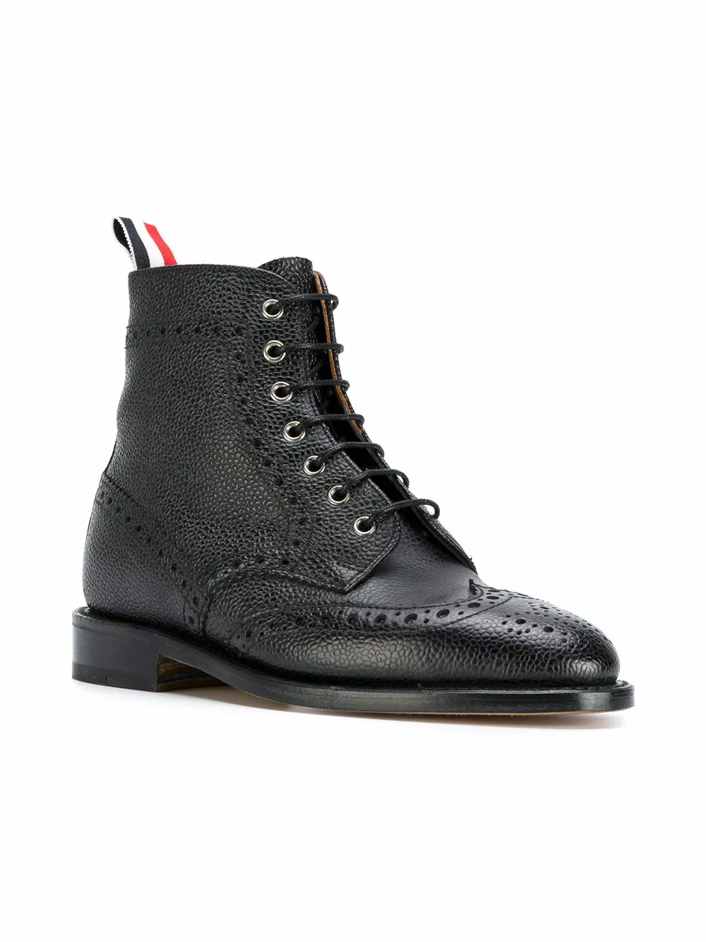 Often traditional, Browne’s footwear relies on texture and minor detailing for that avant-garde twist the brand is known for. Fashioned from the outstanding pebble grained leather incorporated to most of Browne’s leatherwork, these black brogue inspired boots feature an almond toe, a lace-up front fastening, a pull tab at the rear, a branded insole, a leather insole, a leather sole and a wingtip design.
