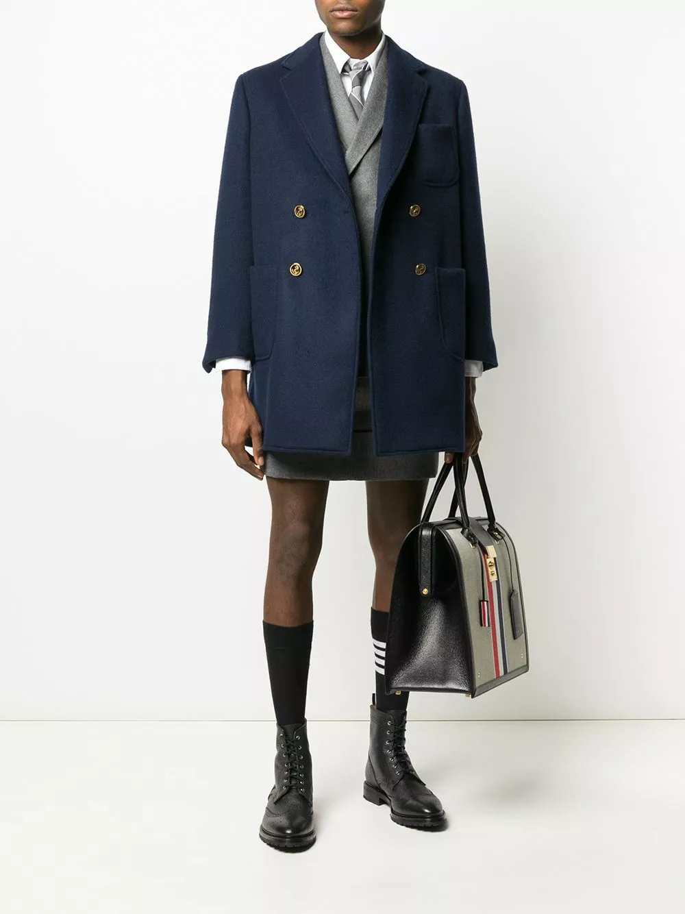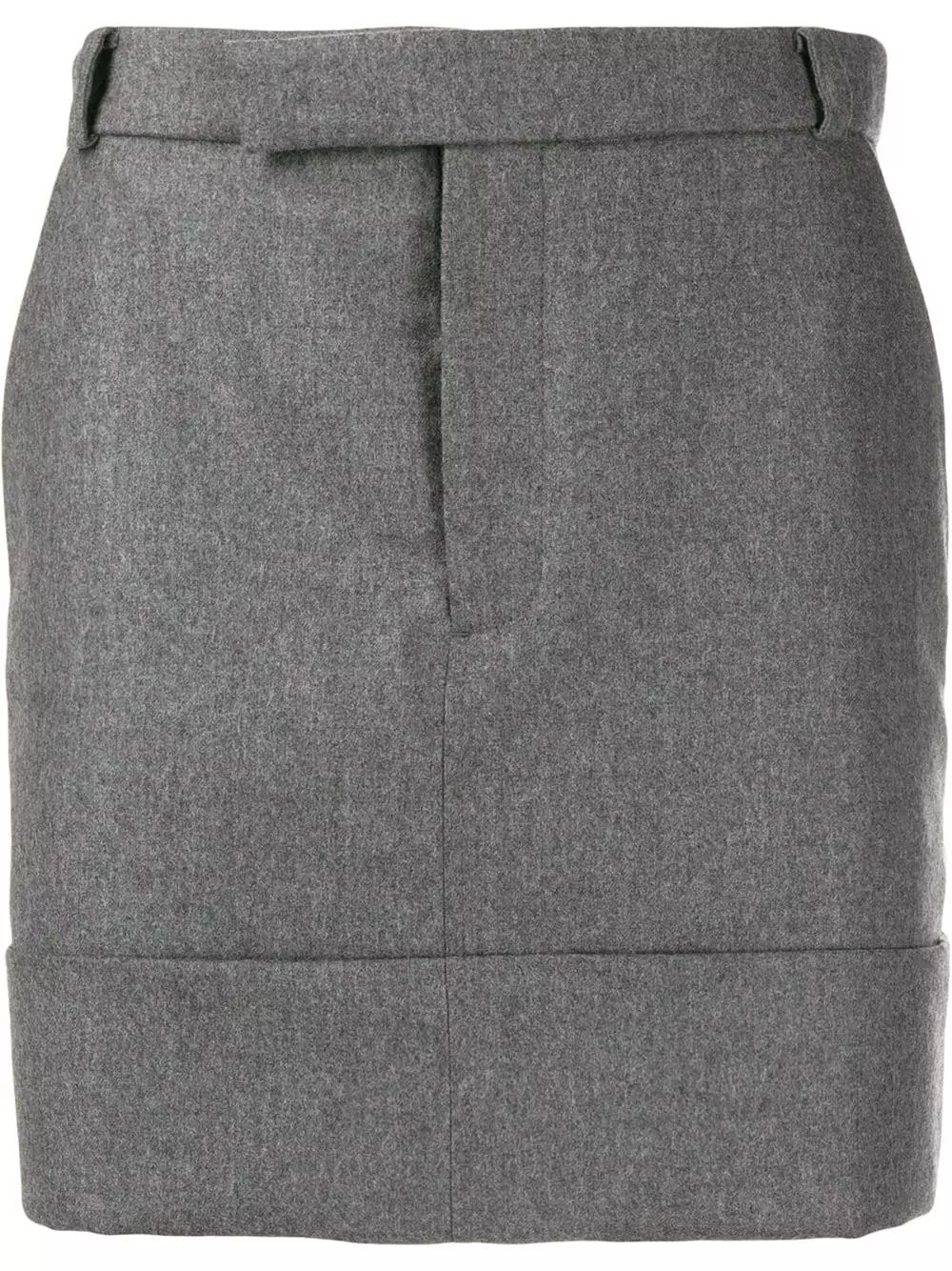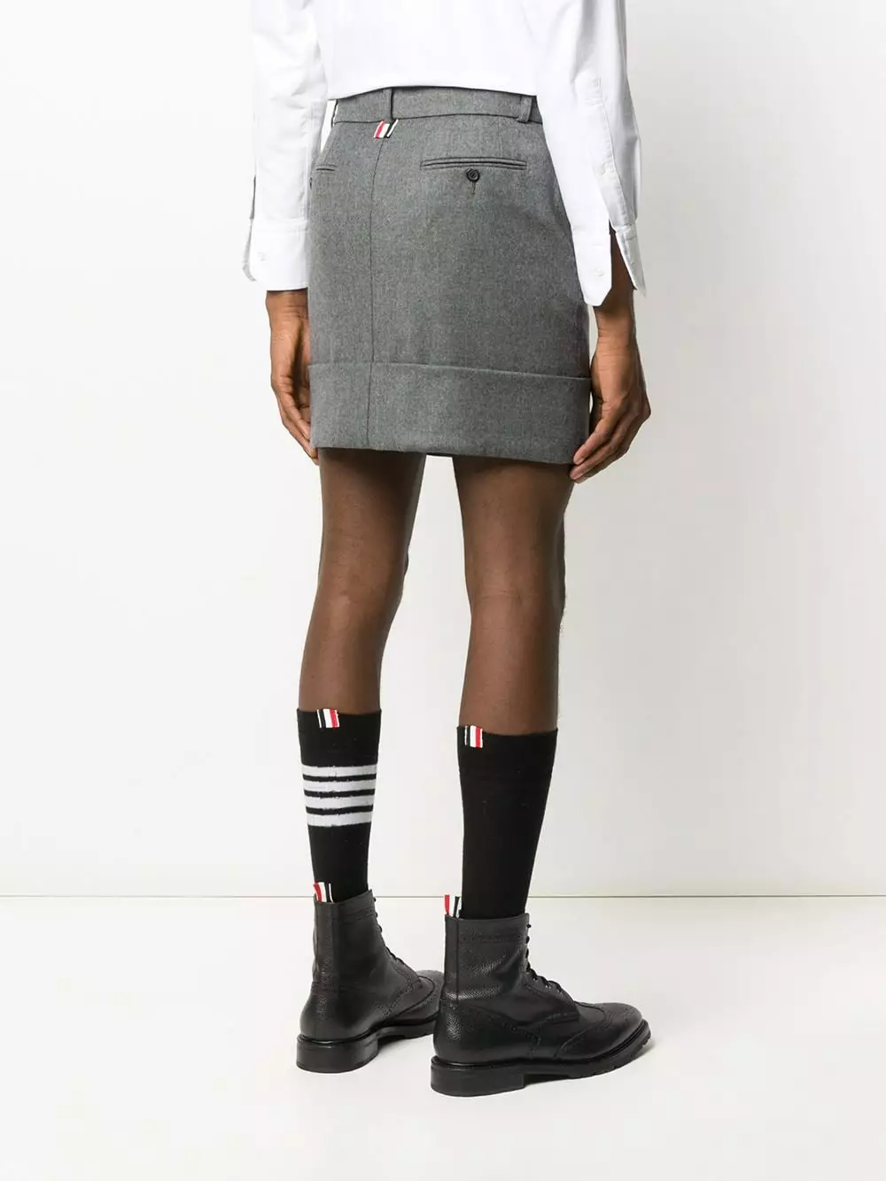 Never expect regular when it comes to Thom Browne and this mid-thigh skirt just proves it! Crafted from soft medium grey wool, this mini skirt is for the ones who are not afraid to go edgy. Dare to use it! Featuring a mid rise, a concealed front fastening, side seam pockets, a turned up hem and rear welt pockets.