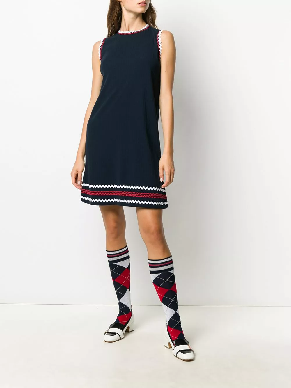 Update your wardrobe with Thom Browne. This dark blue cotton ribbed dress is cut for shift shape and trimmed with scalloped detailing. Make space in your collection.